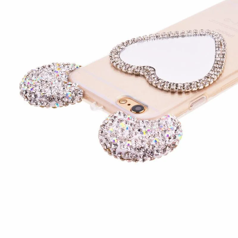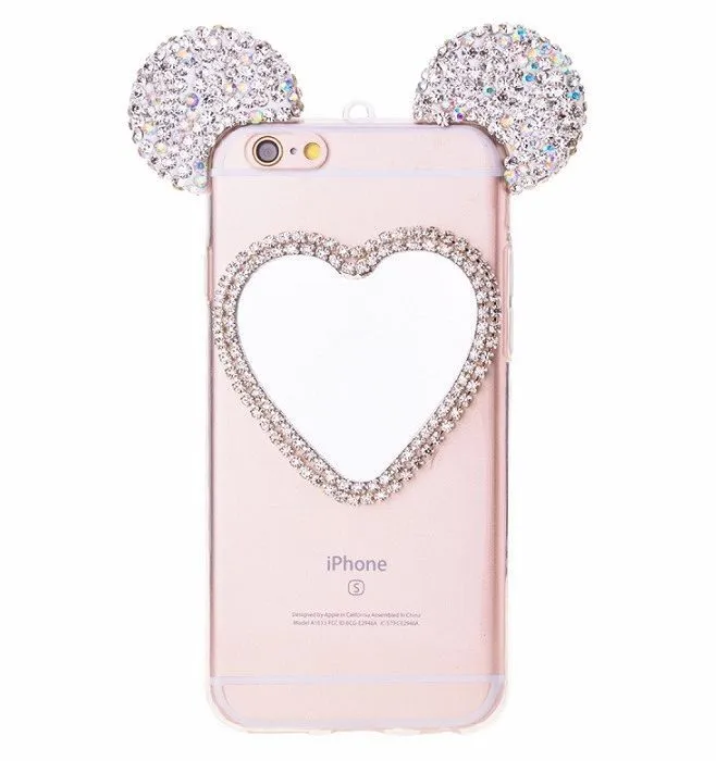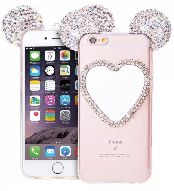 Очень милый чехол для iPhone 6/6S украсит собой Ваш телефон, буквально превратив его в сияющую драгоценность. Ушки мышки с переливающимися стразами будут ярко сверкать на свету, привлекая внимание. Сзади на чехле есть зеркальце в виде сердечка, также украшенное стразами, в которое в любой момент можно будет посмотреться, чтобы проверить макияж или просто полюбоваться собой.