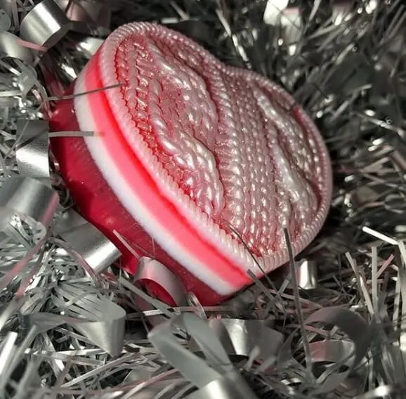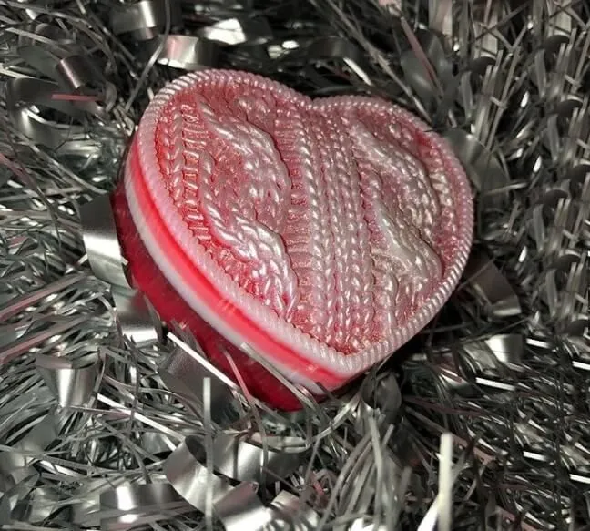 Мыло ручной работы в виде сердечка с вязаными узорами станет идеальным подарком для членов Вашей семьи, второй половинки или друзей! Оригинальный дизайн сразу привлекает к себе внимание, яркие цвета радуют глаз, а восхитительный аромат карамели пленяет своей сладостью. Мыло очень хорошо пенится и будет нежно очищать кожу, не пересушивая ее, а даря только приятные ощущения. Оно упаковано в подарочную коробочку и перевязано красивой лентой.
