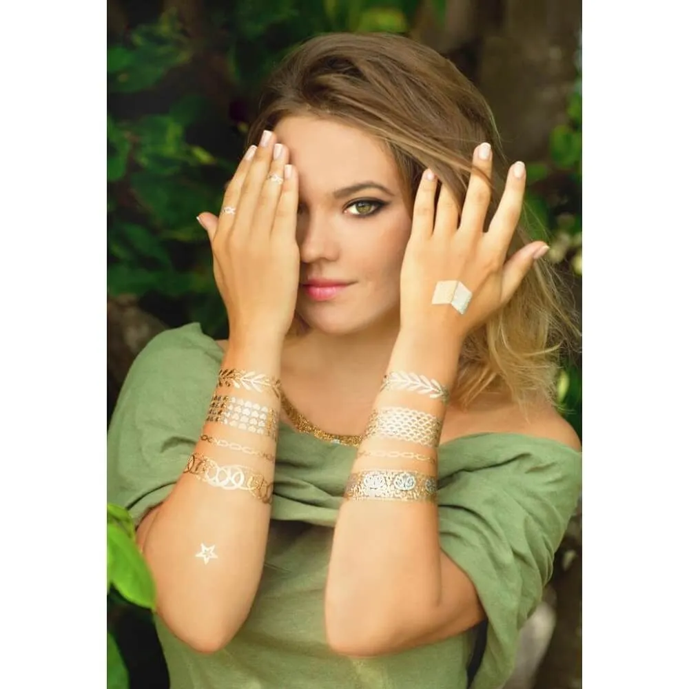 Коллекция временных тату для тела "Секрет" из двух листов переводных узоров формата А5 с разным дизайном. Золотистое мерцание тату притягивает к себе внимание и Вы несомненно будете самой заметной персоной на любом мероприятии!