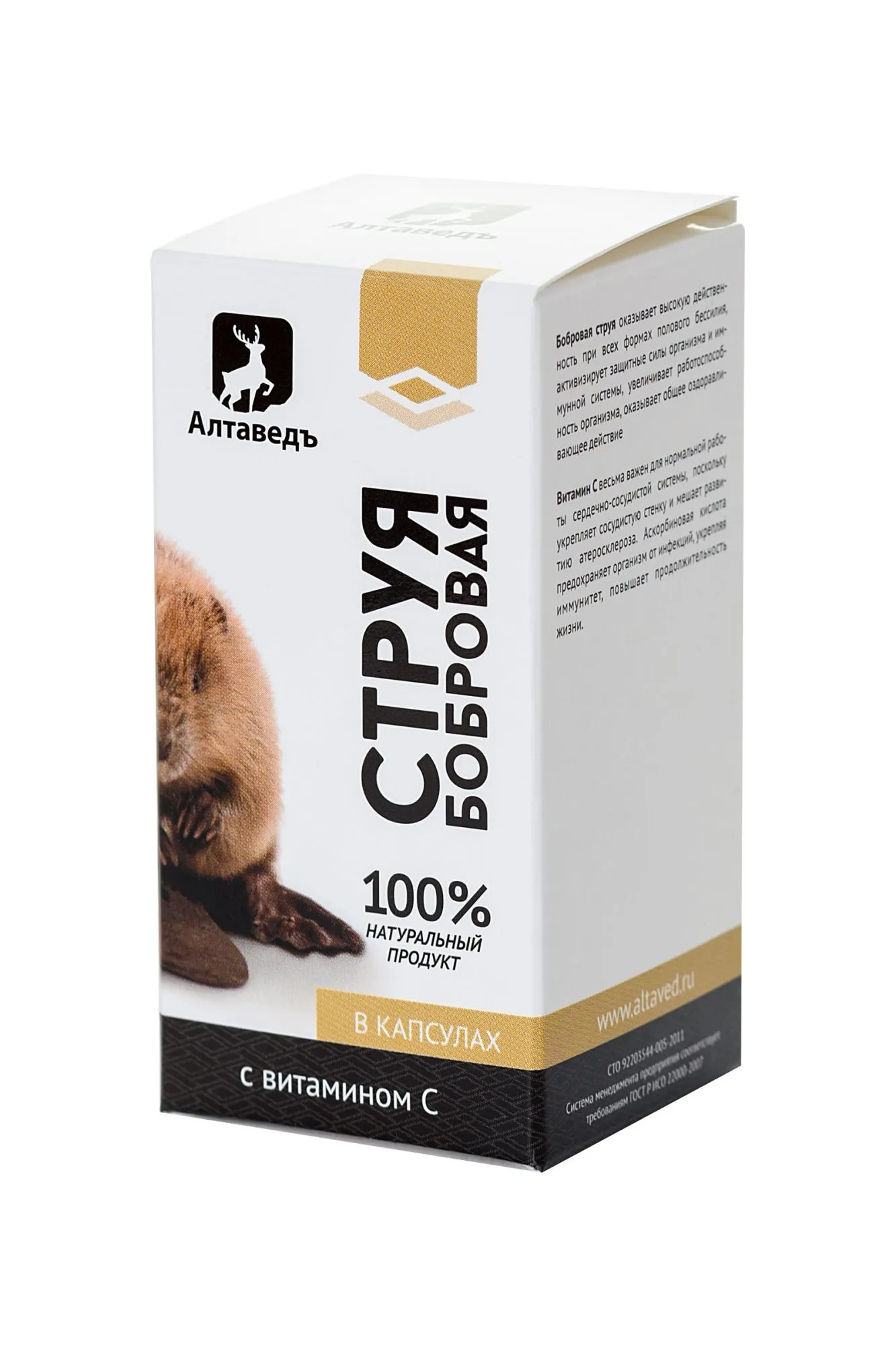 Бобровая струя – природный антибиотик и адаптоген, оказывает высокую эффективность при всех формах полового бессилия, активизирует защитные силы организма, увеличивает работоспособность, омолаживает и очищает организм, обладает регенерирующим и восстанавливающим действием, улучшая работу каждого органа и организма в целом. Витамин С весьма важен для нормальной работы сердечно-сосудистой системы, поскольку укрепляет сосудистую стенку и мешает развитию атеросклероза. Аскорбиновая кислота предохраняет организм от инфекций, укрепляя иммунитет, удлиняет продолжительность жизни. В случае курения, потребность в суточной дозе витамина С гораздо возрастает. Показания к применению: нормализует работу нервной системы, оказывая одновременно успокаивающее и тонизирующее действие; помогает снять напряжение и раздражительность, вызывая прилив сил и повышая физическую активность; помогает справиться с гинекологическими заболеваниями у женщин; импотенции, преждевременной эякуляции и воспалительных процессов в половых органах у мужчин; для людей среднего и пожилого возраста рекомендовано с целью омоложения и предупреждения преждевременного угасания половой функции организма; существенно снижает риск возникновения атеросклероза и способствует рассасыванию холестериновых бляшек Способ применения: употреблять внутрь по 1 капсуле 3 раза в день во время еды, запивая жидкостью (вода, чай, сок).