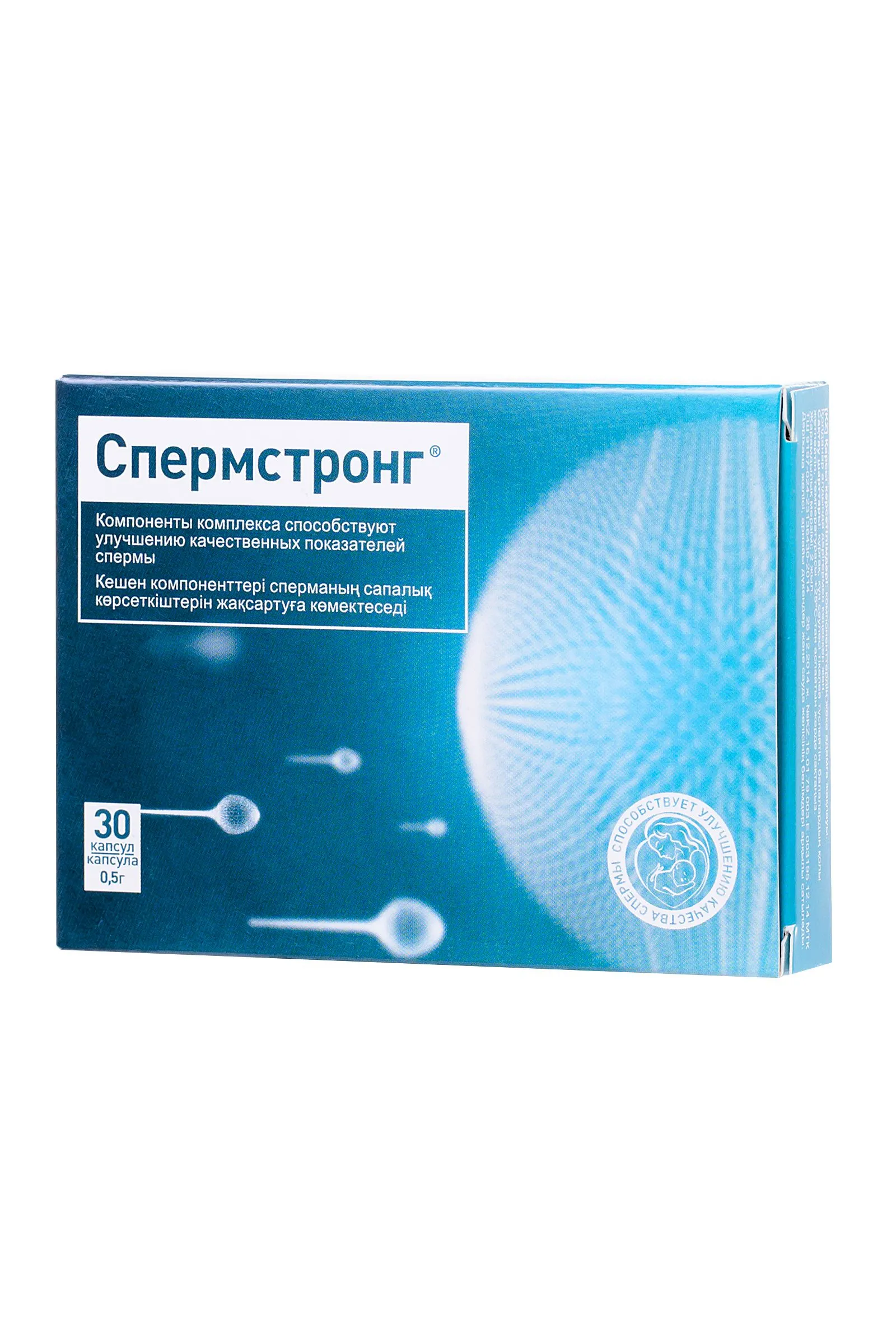 Активные компоненты препарата “Спермстронг™” способствуют восстановлению нормальной подвижности сперматозоидов, их созреванию. Препарат эффективен в комплексной терапии идиопатического мужского бесплодия (при нарушении репродуктивной функции у мужчин, обусловленном снижением качества спермы – недостаточной концентрацией сперматозоидов, уменьшением подвижности сперматозоидов и их абсолютного количества). Спермстронг способствует улучшению качественных показателей спермы: повышаются концентрация, подвижность, количество и оплодотворяющая способность сперматозоидов стимулированию сперматогенеза и кровообращения в половых органах улучшению общего самочувствия, повышению либидо уменьшению утомляемости, и раздражительности повышению умственной и физической работоспособности, памяти уменьшению потоотделения нормализации обмена веществ и укреплению иммунитета Рекомендуется мужчинам, нуждающихся в улучшении качественных показателей спермы. Рекомендуется в качестве источника L-карнитина, витаминов С, У, В5, В6, селена, марганца, цинка. Рекомендации по применению: Взрослым мужчинам по 1 капсуле 2 раза в день. Продолжительность приема – 3-6 месяцев. Состав: Arginine (L-аргинин); Acetyl-L-Carnitine (ацетил-L-карнитин); Vitamin С (витамин С); Еxtractum Аstragalus membranaceus (экстракт астрагала); Vitamin Е (витамин Е); Vitamin В5 (витамин В5); Manganum gluconate (марганца глюконат); Zinc sulfate (цинка сульфат); Vitamin В6 (витамин В6); «Селексен». Вспомогательные компоненты: магния стеарат, магния оксид. Противопоказания: Индивидуальная непереносимость компонентов. Перед применением рекомендуется проконсультироваться с врачом. Форма выпуска: 30 капсул по 0,5 г БАД, НЕ ЯВЛЯЕТСЯ ЛЕКАРСТВОМ.