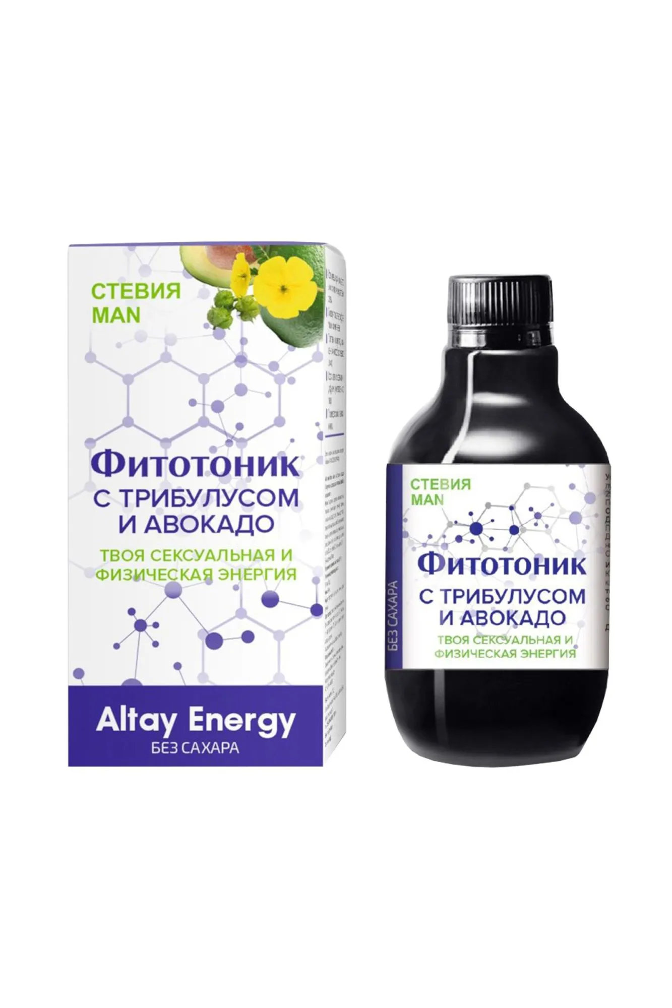 Растительный сироп “Фитотоник Стевия Man с трибулусом и авокадо” благодаря свойствам входящих в состав целебных трав, экстрактов, витаминов и микроэлементов оказывает выраженное противовоспалительное действие на органы мочеполовой системы мужчины, улучшает кровоснабжение органов малого таза, повышает физическую выносливость, восстанавливает мужскую половую активность. Активные компоненты: трибулус (якорцы стелющиеся), маралий корень (левзея сафлоровидная), калган, пион, шиповник, экстракт пальмы сабаль, экстракт йохимбе, экстракт авокадо, экстракт женьшеня, экстракт маки перуанской, стевия; L-аргинин, яблочный пектин, янтарная кислота, фруктоза. Трибулус восстанавливает баланс синтеза тестостерона, эффективен в терапии различных видов импотенции, усиливает сексуальные возможности, а также увеличивает величину и силу мышц у спортсменов. Маралий корень устраняет усталость при упадке сил, повышает физическую выносливость и умственную активность. Калган купирует воспалительные процессы, восстанавливает повреждённые клетки печени, помогает вернуть сексуальное желание, предотвратить простатит, способствует более интенсивной выработке мужских половых гормонов. Пион усиливает поступление крови к половым органам, нормализует уровень тестостерона, избавляет от раздражительности и бессонницы. Экстракты пальмы сабаль, йохимбе, авокадо, женьшеня и маки перуанской нормализуют функцию предстательной железы, применяются для профилактики и терапии простатита, заболеваний мочеполовой системы. Это растения афродизиаки усиливающие половое влечение. L-аргинин повышает иммунные реакции, стимулирует половую активность и усиливает эрекцию. Стевия стимулирует ферментную активность, ускоряя метаболизм, снижает уровень сахара и холестерина в крови. Янтарная кислота – антиоксидант и иммуномодулятор. Рекомендации по применению: Употреблять по 2 столовые ложки сиропа 1-2 раза в сутки до еды. Пищевая ценность на 100 г продукта: углеводы 10,0 г. Энергетическая ценность на 100 г продукта: 36,8 ккал/ 150 кДж. Продукт не содержит ГМО. Условия хранения: хранить в защищенном от прямых солнечных лучей и недоступном для детей месте, при температуре не выше 25°С и относительной влажности не более 75%. После вскрытия хранить в холодильнике не более 3 месяцев. Срок годности: 18 месяцев. Объем: 250 мл