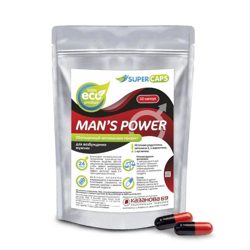 Средство для мужчин для повышения либидо и сексуальной страсти Man's Power от компании SuperCaps. Универсальный комплекс средств для повышения мужского здоровья разработан с использованием универсальной формулы по гранулированию активных компонентов. Благодаря особой оболочке гранул действие продукта пролонгируется. Эффект возбуждения наступает через 2-3 часа и действует до 48 часов. Курсовой прием аккумулирует эффективность и длительность действия препарата.