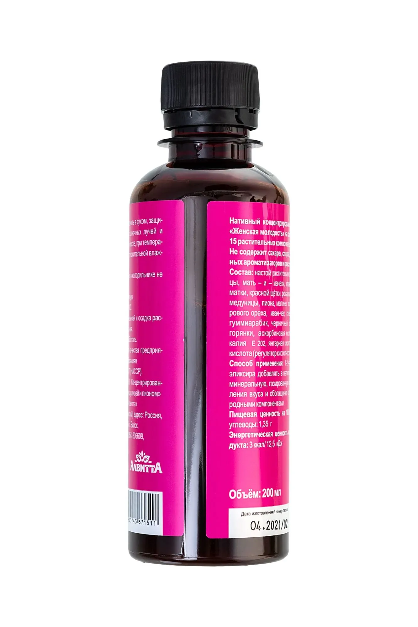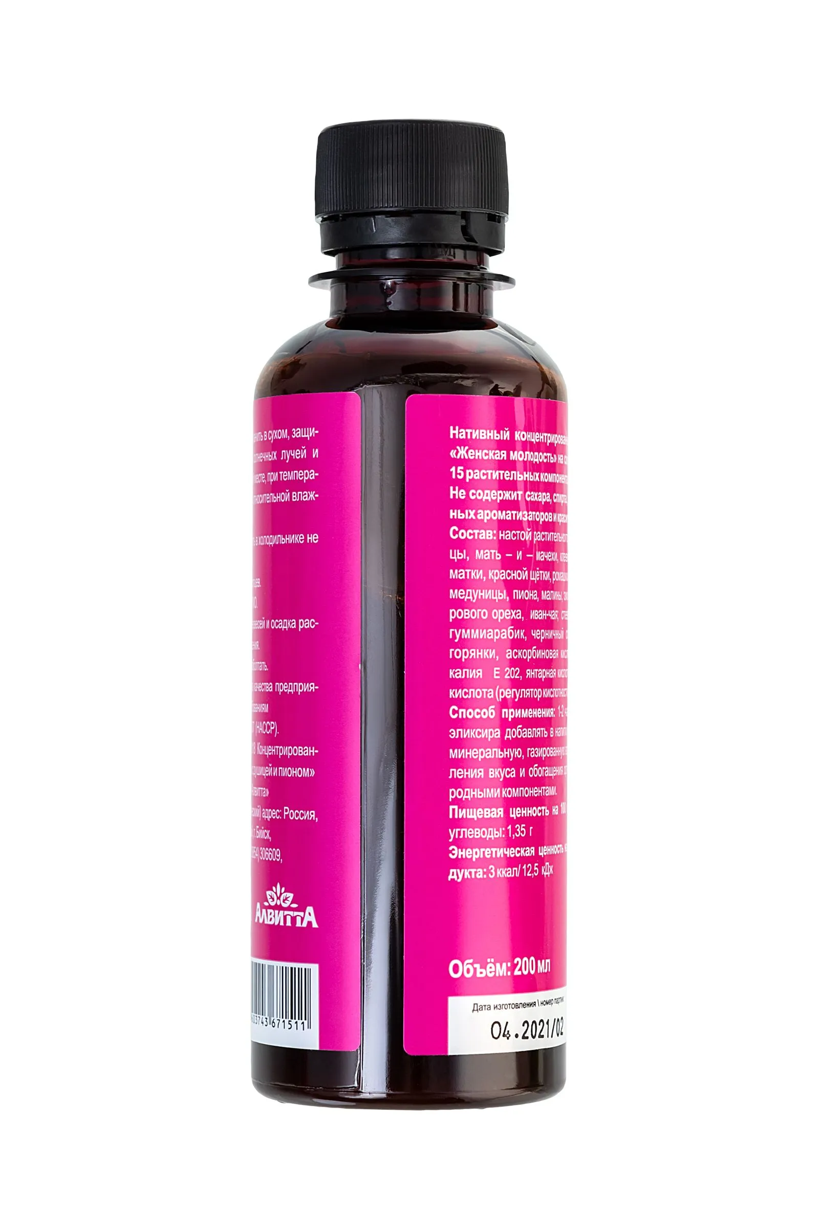 Концентрированный эликсир «Женской молодости» на соке черники из 15 растительных компонентов -это уникальное оздоровительное природное средство. Активные вещества, содержащиеся в эликсире, способствуют: регуляции гормонального баланса, снижению климактерических проявлений активации иммунной системы, улучшению функций эндокринной системы и состава крови, повышению умственной и физической работоспособности, усилению антиоксидантной защиты организма, замедляя старение клеток. Не содержит сахара, спирта, искусственных ароматизаторов и красителей Способ применения: 1-2 чайной ложки эликсира добавлять в напитки (чай, кофе, минеральную, газированную воду) для усиления вкуса и обогащения организма природными компонентами. Противопоказания: индивидуальная непереносимость компонентов, беременность. Объём: 200мл