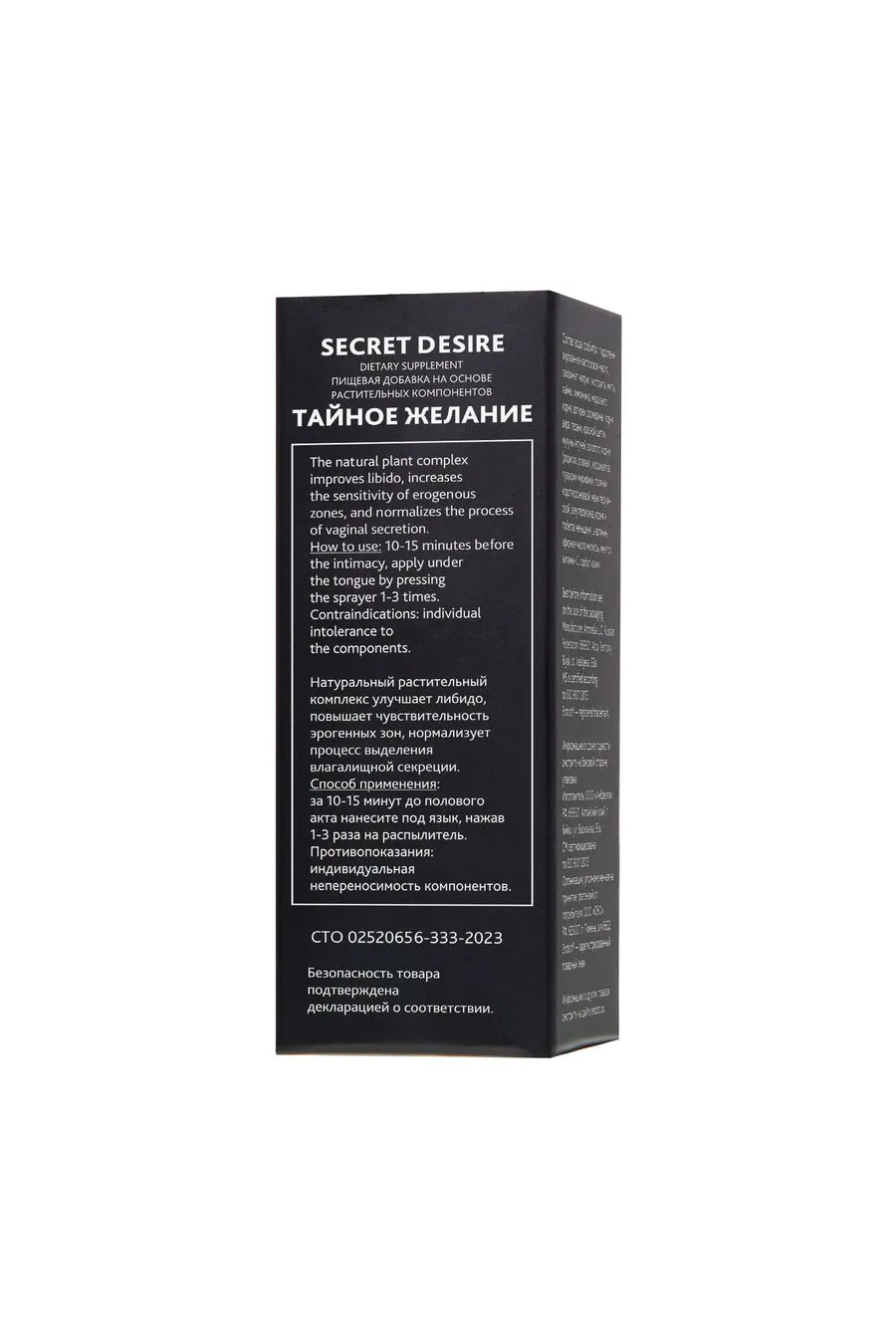 Возбуждающее средство для женщин в форме спрея – натуральный продукт, увеличивающий сексуальное желание, тонизирующий, улучшающий общее самочувствие. Спрей «Тайное желание» стимулирует кровообращение в органах малого таза, усиливая приток крови к гениталиям и позволяя получить больше удовольствия от секса, улучшая либидо, обостряя и повышая чувствительность эрогенных зон. Благодаря комплексу биосинергетически взаимодействующих активных компонентов способствует повышению уровня возбудимости, усилению ощущения при достижении оргазма и нормализации процесса выделения влагалищной секреции. Устраняет скованность и боязнь сексуальной близости, расслабляет мышцы, абстрагирует от внешних раздражителей и концентрирует на половом партнере. Оказывает общеукрепляющее воздействие на весь женский организм. Сбалансированная формула спрея влияет на повышение в крови «гормона счастья» – серотонина, расслабляющего, повышающего эмоциональный настрой женщины и ее чувство удовлетворенности сексом. Применение мицеллярных форм растительных экстрактов (вытяжек лекарственных трав) обеспечивает высокую степень проникновения и всасываемость активных мицеллированных ингредиентов при сублингвальном приеме (подъязычно) и позволяет в несколько раз повысить биоусвояемость необходимых для жизнедеятельности организма веществ, повышая их биодоступность в 5-10 раз.