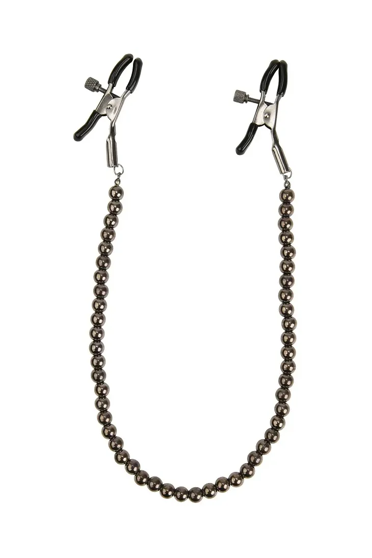 —Черные зажимы на соски с цепочкой из бусин