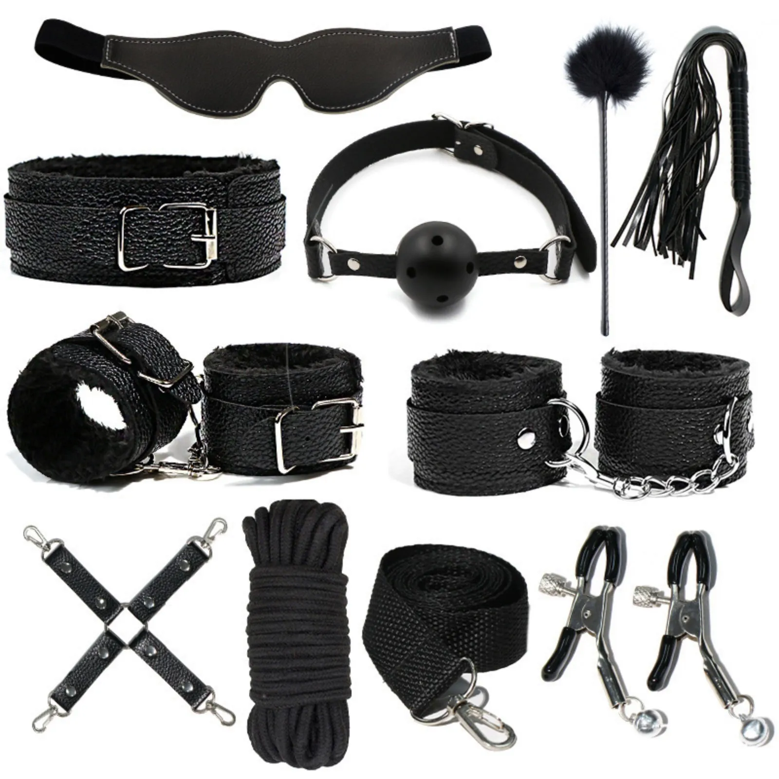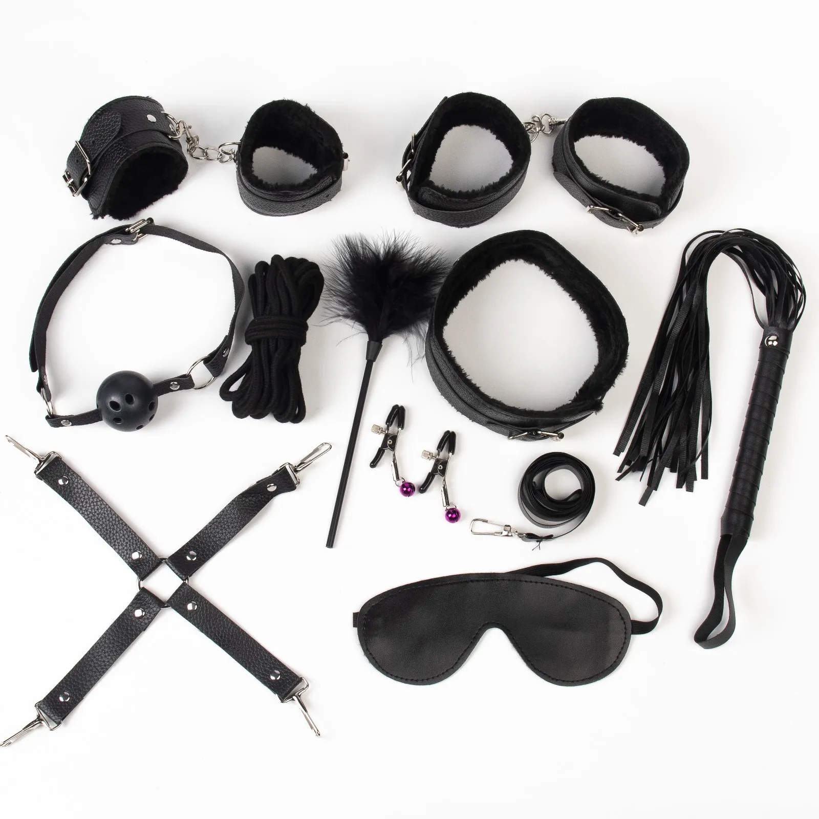 БДСМ набор выполнен из эко-кожи с искусственным мехом. Все ремни имеют систему регулировки. В состав набора входят 11 предметов: наручники, оковы, кляп, ошейник, поводок, верёвка, маска, зажимы для сосков, плеть, крестовина, пуховка.