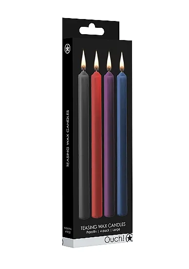Teasing Wax Candles Large – набор из 4-х разноцветных восковых свечей. Усильте ощущения, увеличьте адреналин, и насладитесь беспрецедентным возбуждением, когда капающий горячий воск будет касаться кожи, не вызывая ожогов. Восковые BDSM-свечи в сочетании с повязкой на глазах или другим приспособлением для бондажа гарантируют увлекательное приключение всем участникам.