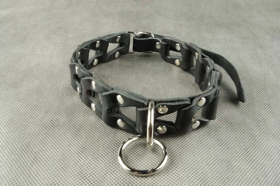 Ошейник из 11 кожаных звеньев, с 24-мя декоративными хольнитенами и одним центральным D-кольцом d 35 мм. Застежка: ремешок с пряжкой. Диаметр обхвата min 320 мм., max 390 мм.