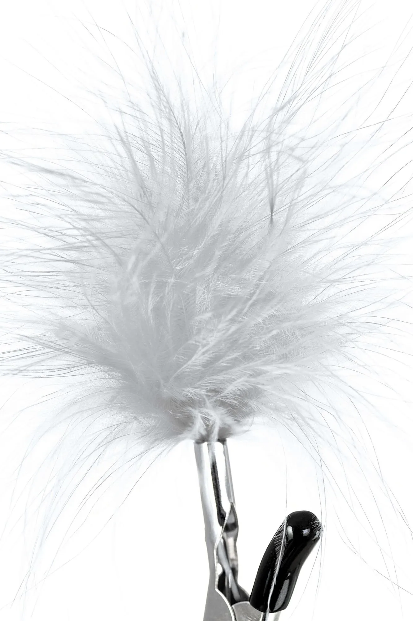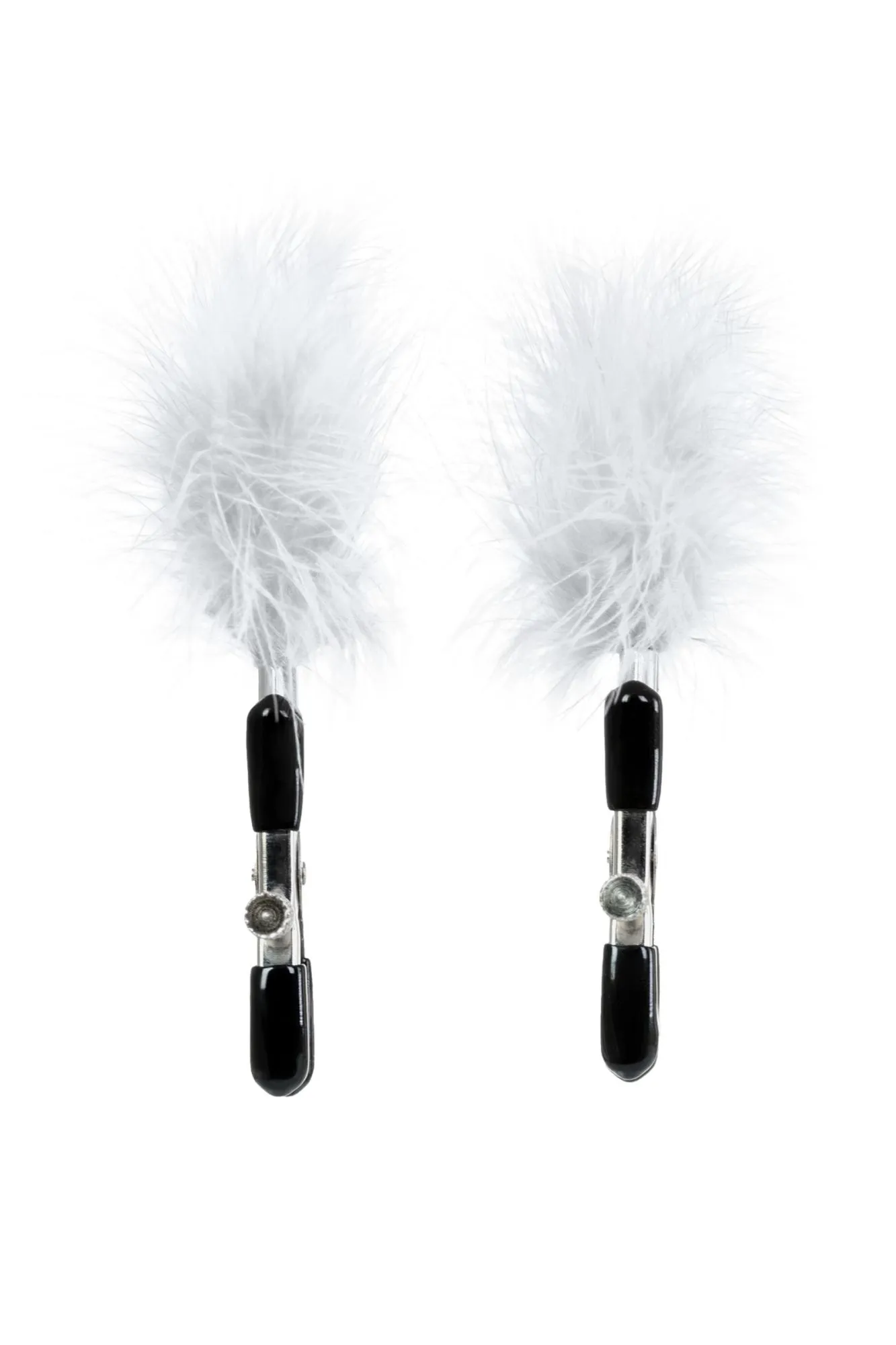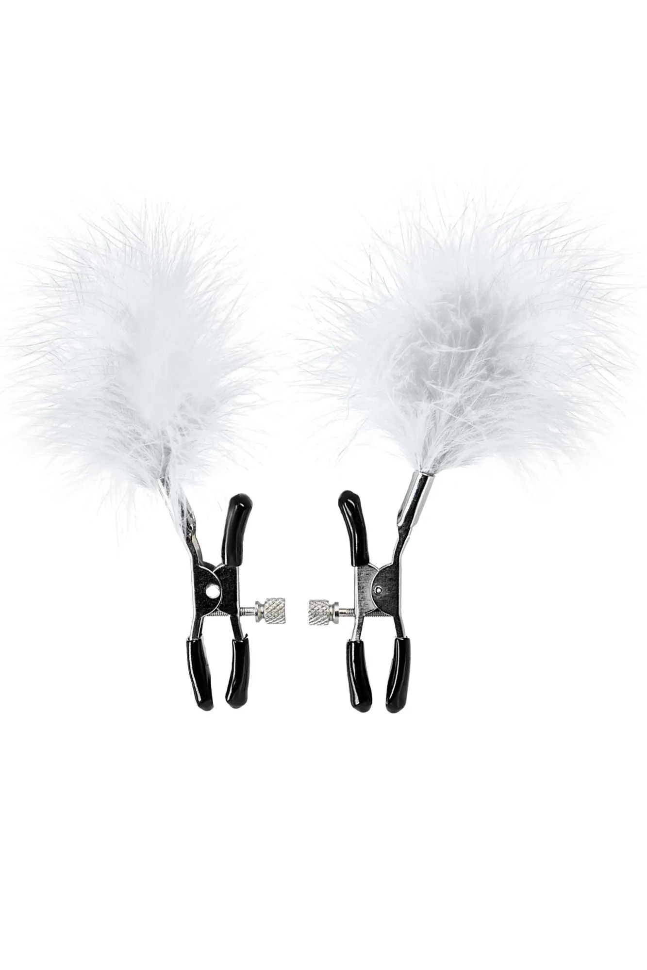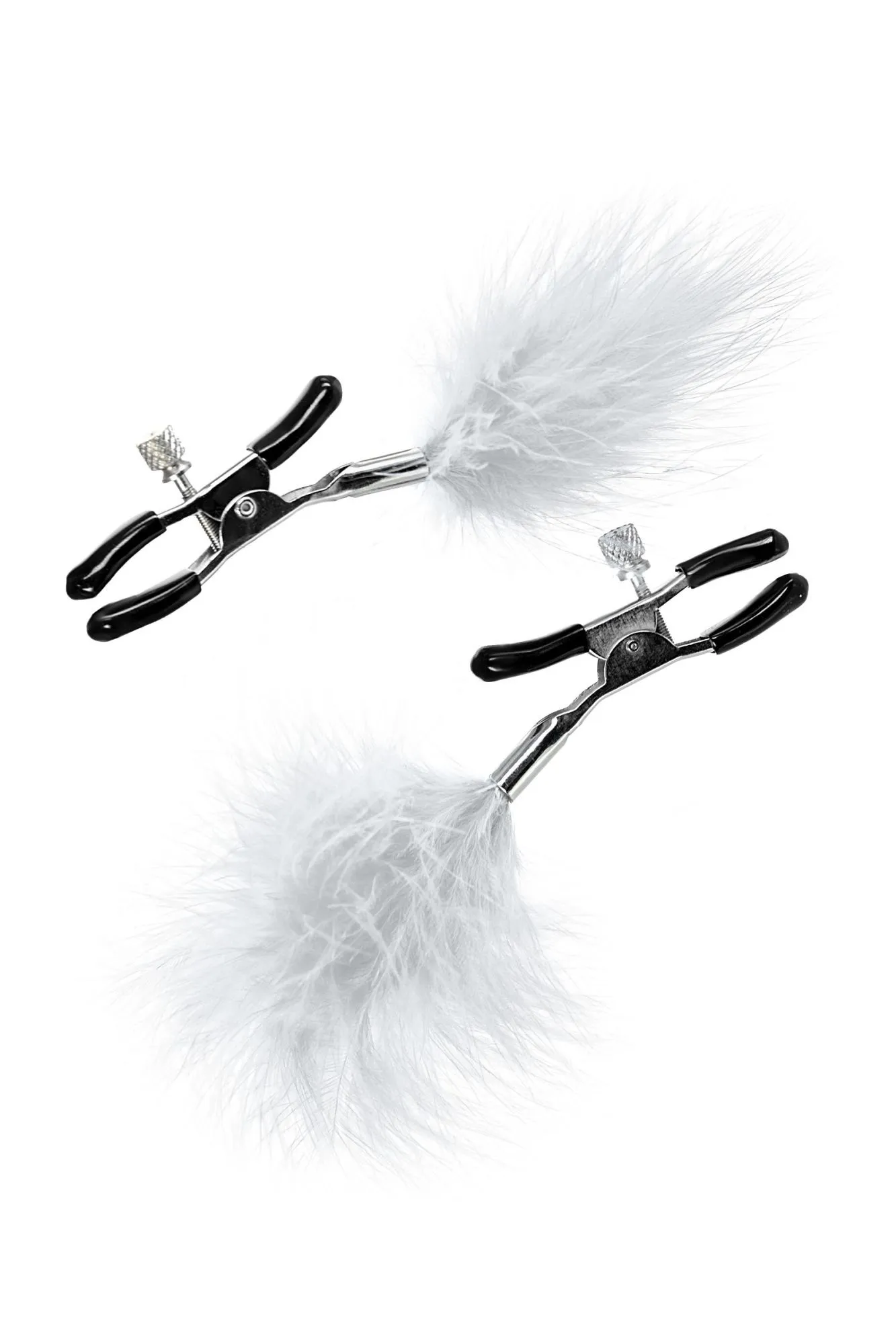 Пожалуй, самые милые из всех зажимов - украшенные перьями. Они стимулируют не только сжатием сосков, но и щекочут грудь. Сдавливание регулируется болтиком и может быть усилено или уменьшено во время интимной игры. Покрытие на концах зажимов защищает нежную кожу.
