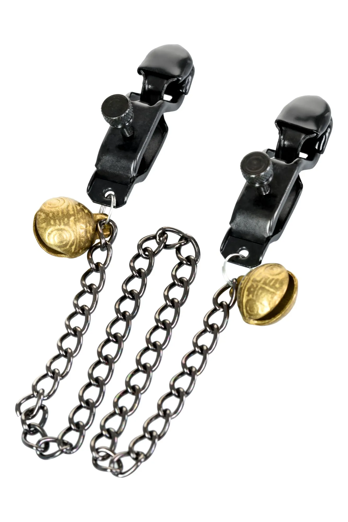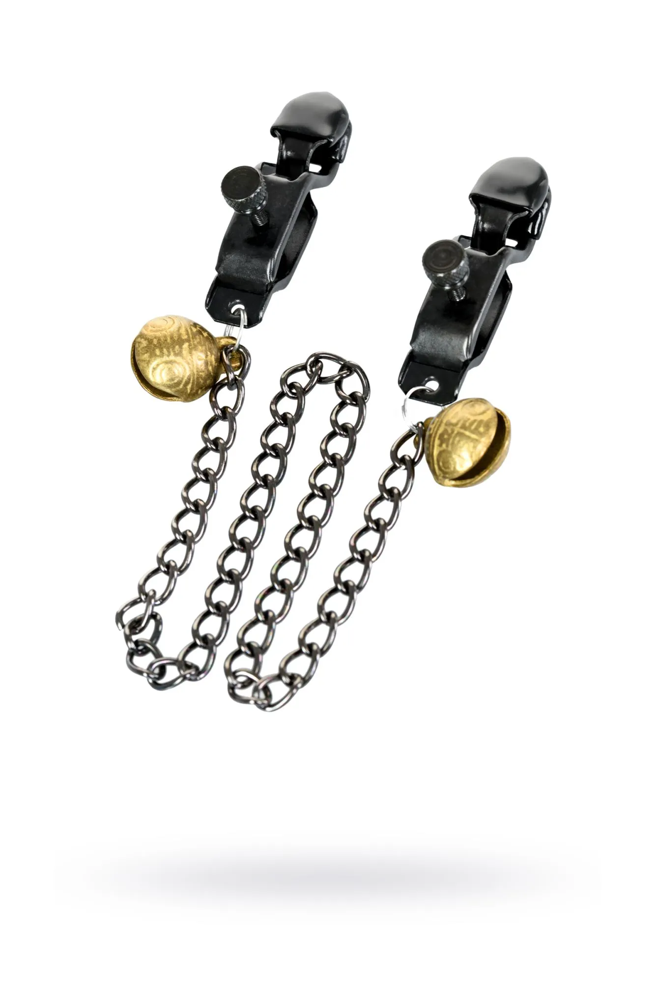 Металлические зажимы для сосков с этническим рисунком дополнены цепочкой. Они добавят перчинки в ваши игры: сами зажимы создадут дополнительную стимуляцию, а колокольчики озвучат каждое движение. Сила сжатия регулируется болтиком.