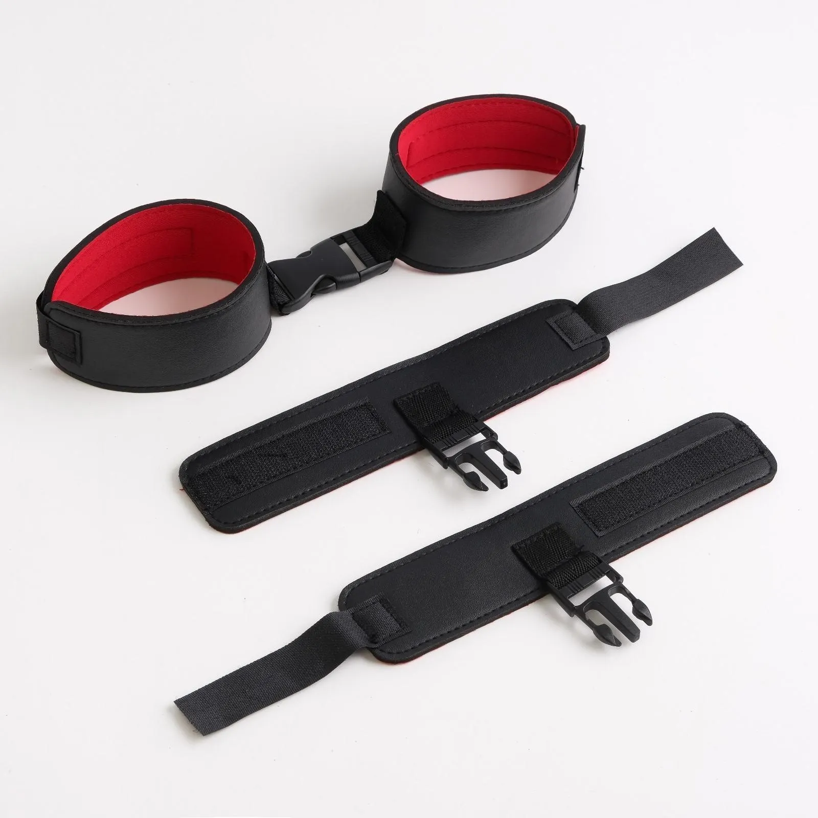 Наручники, оковы и ошейник с мягкой вставкой, которая обеспечит приятное прилегание к телу. Поводок и наручники крепятся к ошейнику при помощи карабина, имеет длину 60 см.