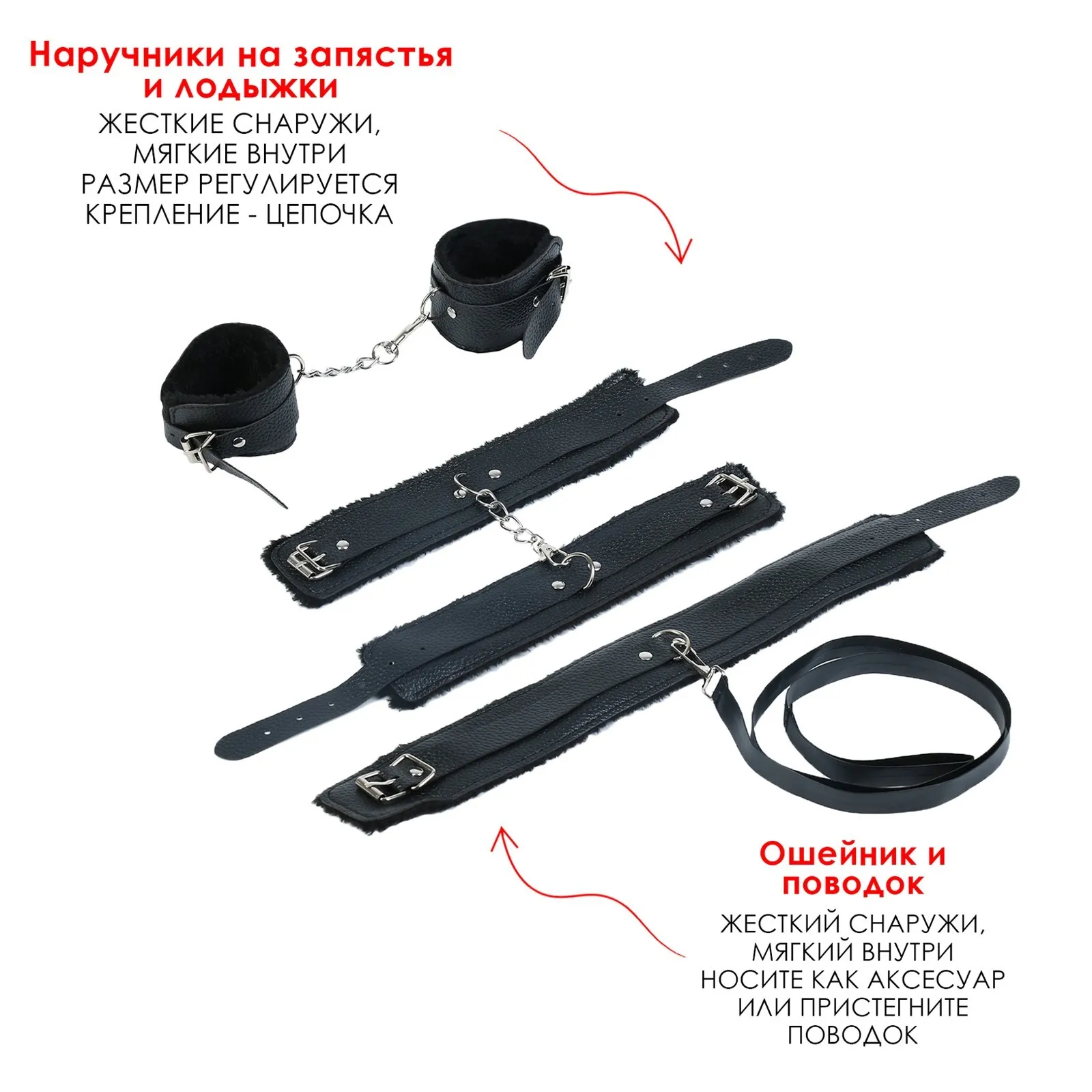 - Наручники выполнены из эко-кожи с меховой вставкой, которая обеспечит приятное прилегание к телу. Все ремни имеют систему регулировки.