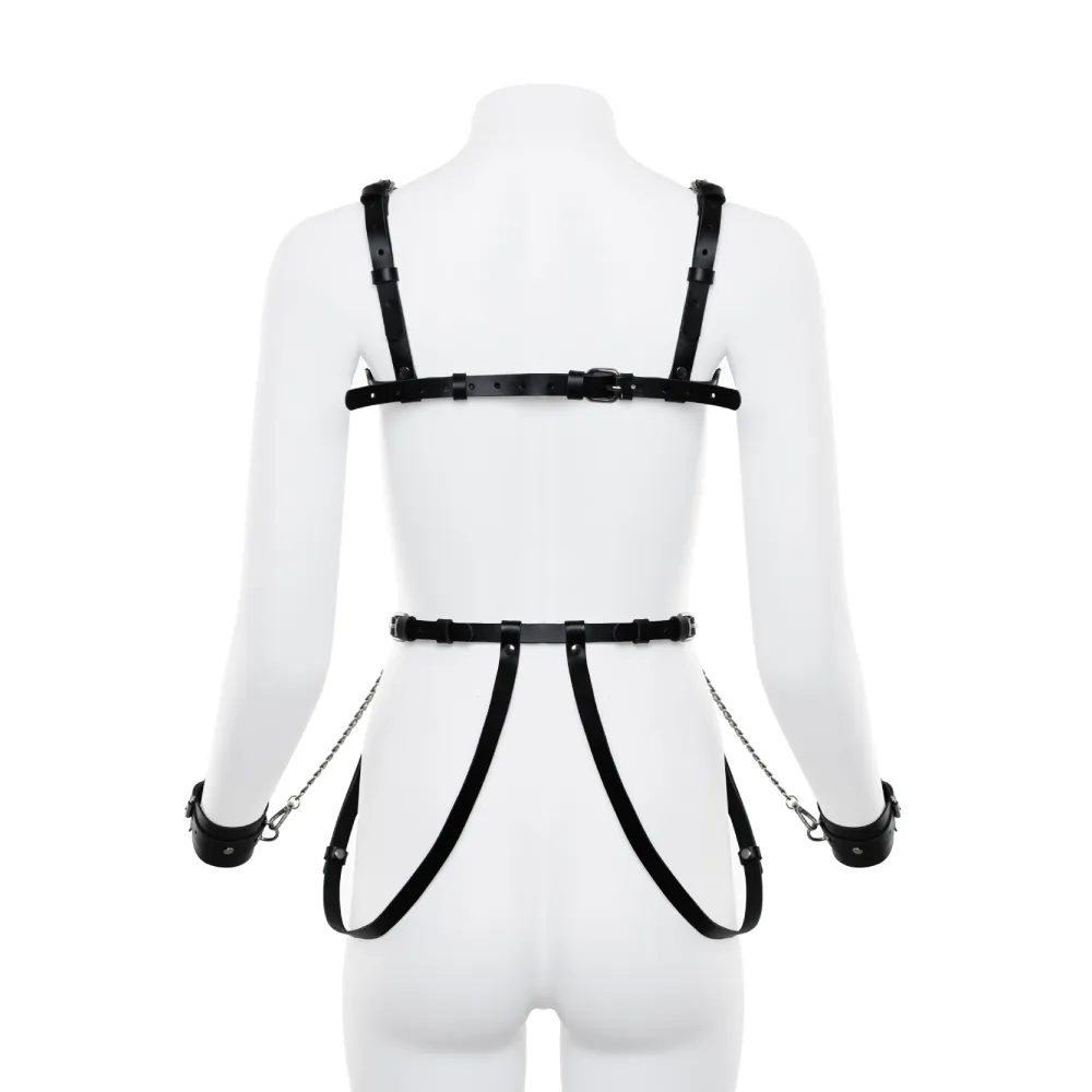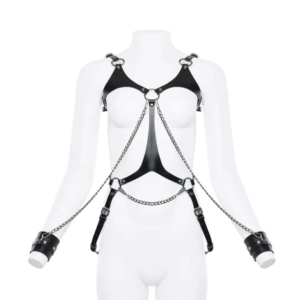 Идеальный аксессуар для ваших страстных игр в спальне в стиле БДСМ. Портупея соединена металлическими цепочками с наручниками. Все ремешки регулируются по длине для комфортной посадки, наручники отстёгиваются.