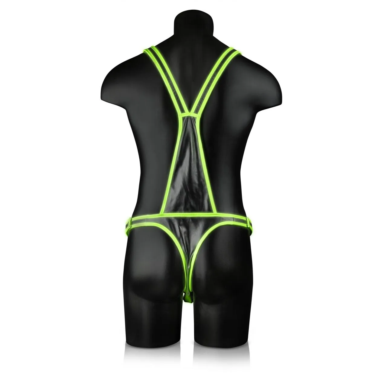 Экстравагантная мужская сбруя с трусами на заклепках для удобного доступа и комфортного ношения. Выполнена из высококачественной экокожи и оформлена люминисцентными полосками. В темноте будут светиться все самые интересные места.
