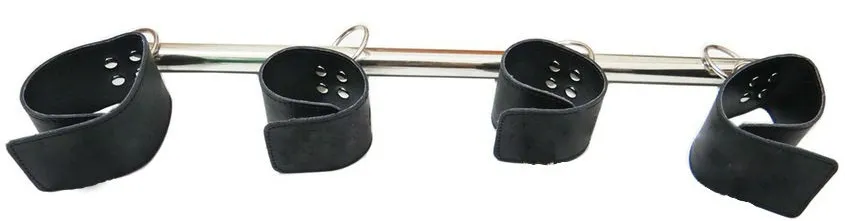 Металлическая штанга серебристго цвета. Длина - 80 см, по всей длине на одинаковом расстоянии друг от друга расположены крепления для рук и ног в виде оков. Оковы изготовлены из кожи, ширина - 5 см, уркашены заклекпами. Размер регулируется при помощи застежек-липучек. Оковы крепятся к штанге при помощи карабинов