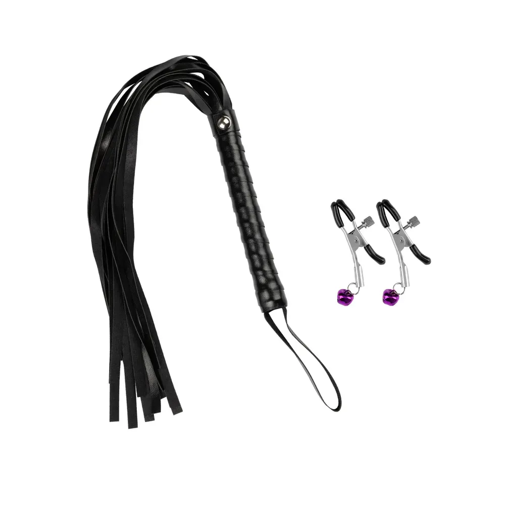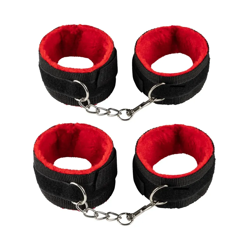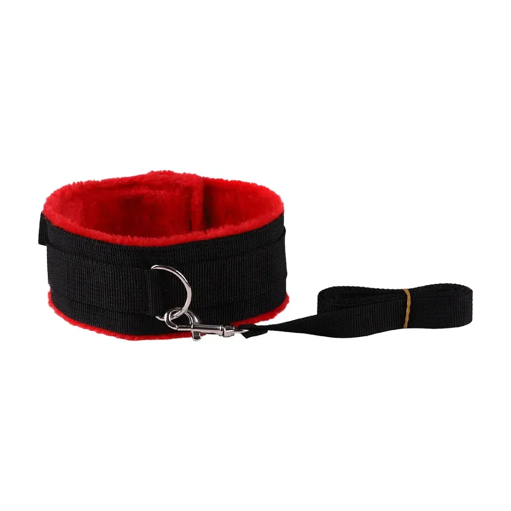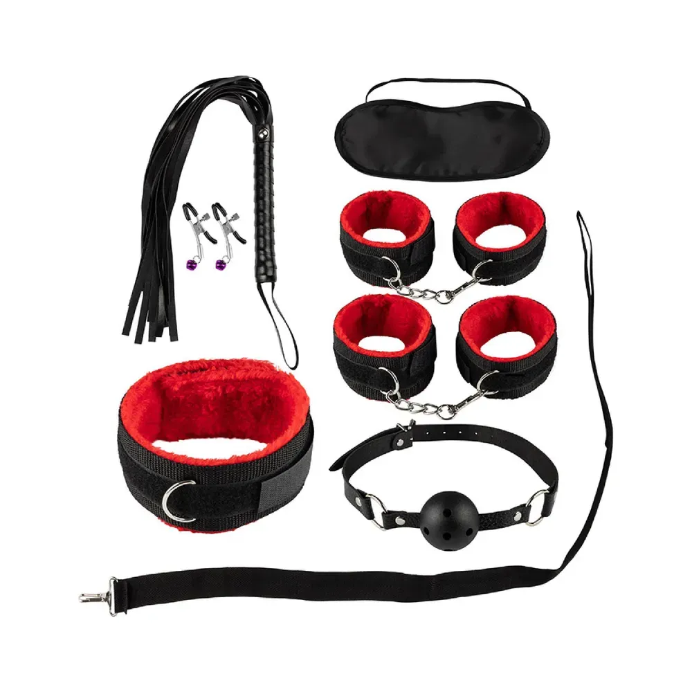 В набор входит: 2 пары кожанных наручников с мехом (для рук и ног), 1 ошейник меховой с поводком, 1 кляп-шар, 1 маска для глаз, 1 плеть-флогер, 2 зажима для сосков. 8 предметов.