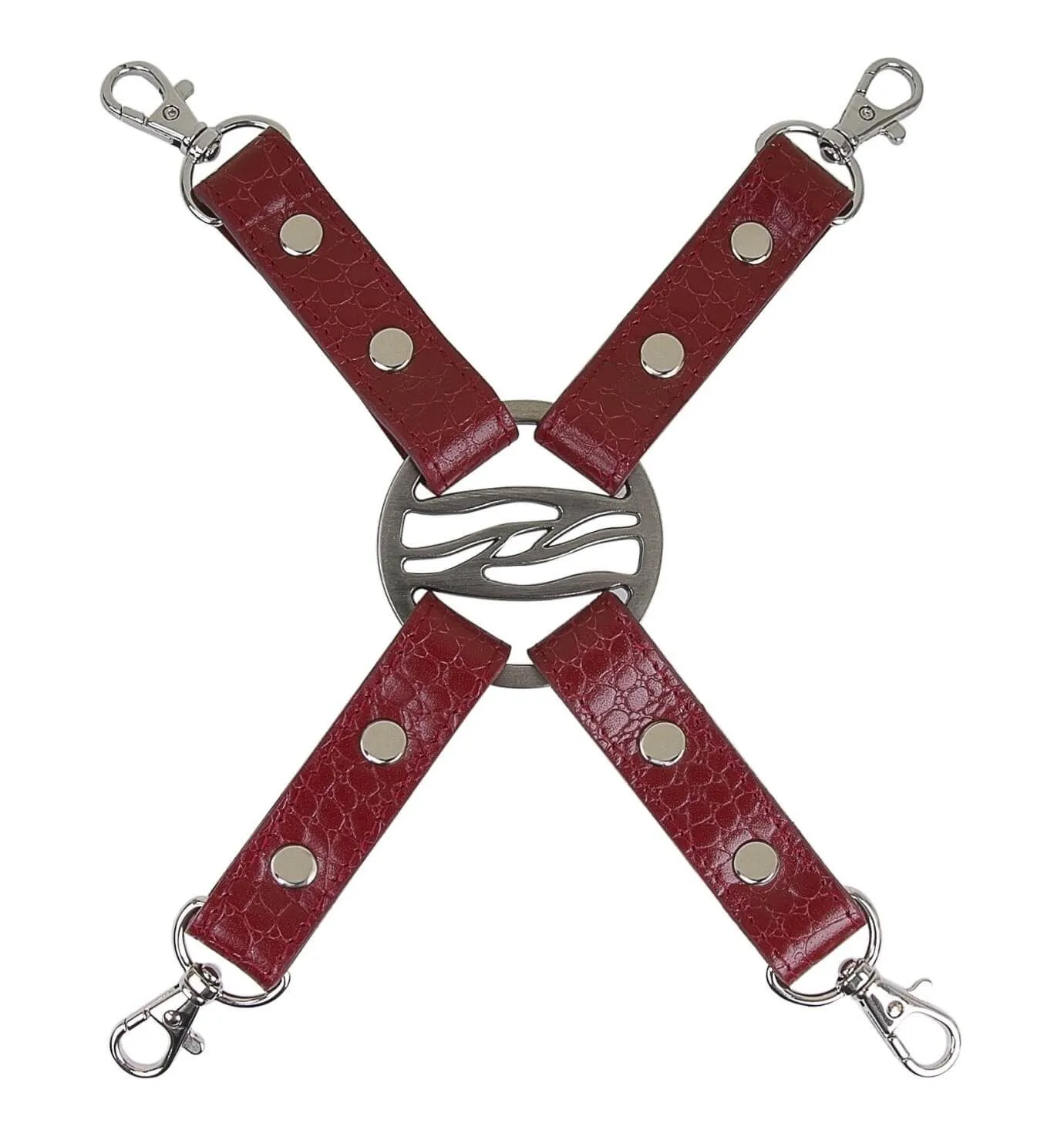 Кожаная сцепка с четырьмя карабинами от бренда Fire Horse предназначена для соединения различных БДСМ аксессуаров. Она выполнена из натуральной кожи красного цвета и декорирована клепками и кольцом с узором внутри. Несмотря на свой изысканный вид, стяжка отличается достаточной прочностью, позволяющей ей выдержать любые проявления неповиновения со стороны партнера. Она надежно зафиксирует руки или ноги непокорного и позволит Вам подойти к его воспитанию со всей ответственностью. Сцепка проста в использовании и надежна, поэтому с ней любая игра с элементами БДСМ будет безопасна.