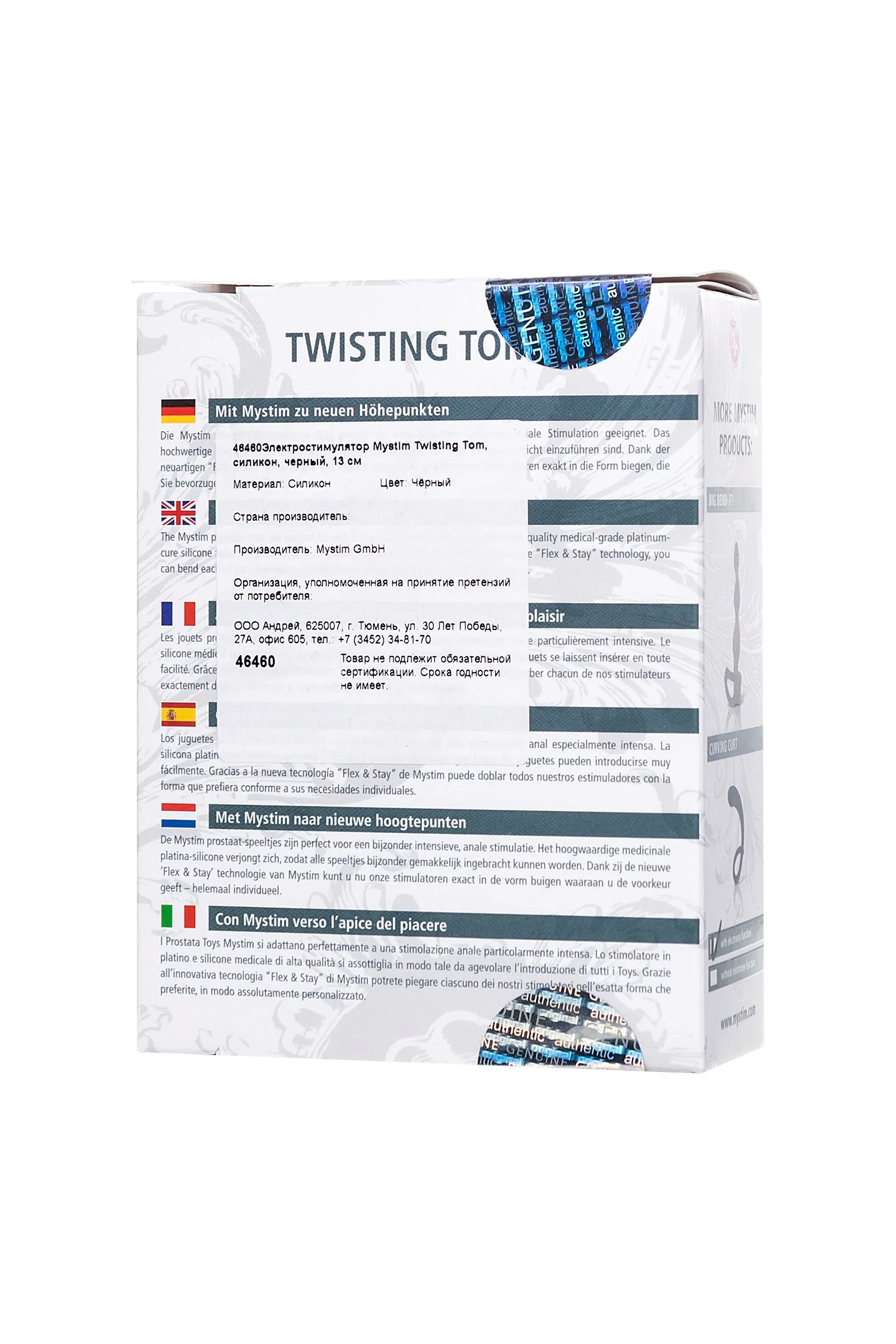 Электростимулятор Mystim Twisting Tom, силикон, черный, 13 см Знакомьтесь – анальный электростимулятор Twisting Tom от немецкого бренда Mystim. Стимулятор анатомически правильной формы, подходящий для стимуляции простаты у мужчин и зоны G у женщин. Преимущество Twisting Tom в его гибкой конструкции благодаря технологии Flex & Stay от Mystim. Просто согните, скрутите или разверните его в то положение, которое вам нравится, и он будет держать заданную форму, пока вы не придадите ему новый вид. Twisting Tom – абсолютная новинка – 4-полярный электростимулятор простаты, с инновационной токопроводящей поверхностью благодаря которой, при подключении к блоку питания Mystim, происходит электростимуляция простаты, зоны G и мышц ануса. Twisting Tom сделан из 100% медицинского силикона с добавлением платины для проводимости тока. Для активации электростимуляции необходимо подключить изделие к цифровому или аналоговому источникам тока (Mystim Tension Lover или Mystim Pure Vibes)в комплект не входят, приобретаются отдельно. Гибкая форма и оптимальный размер Twisting Tom в сочетании с электроимпульсами – превосходная комбинация для адептов и новичков мира удовольствия от анальной стимуляции. Длина 13 см Диаметр в широкой части 3,7 см 100% медицинский силикон Страна бренда Германия