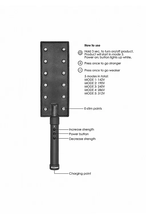 Падл снабжен 12 электрическими контактами с обеих сторон, которыми можно управлять с помощью 3 кнопок на ручке девайса. Напряжение можно регулировать в диапазоне от 142 В до головокружительных 312 В.