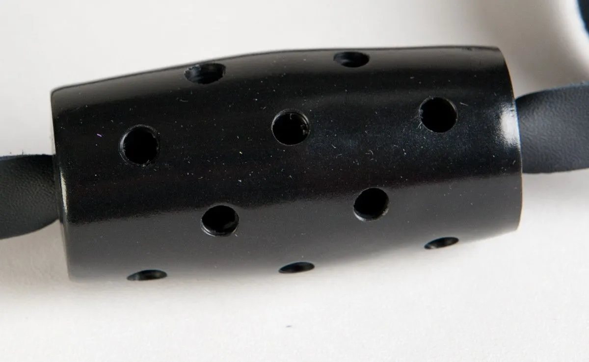 Кляп цилиндрической формы. Материал ПВХ обеспечивает необходимую жесткость, кожаный ремешок - фиксацию на голове.