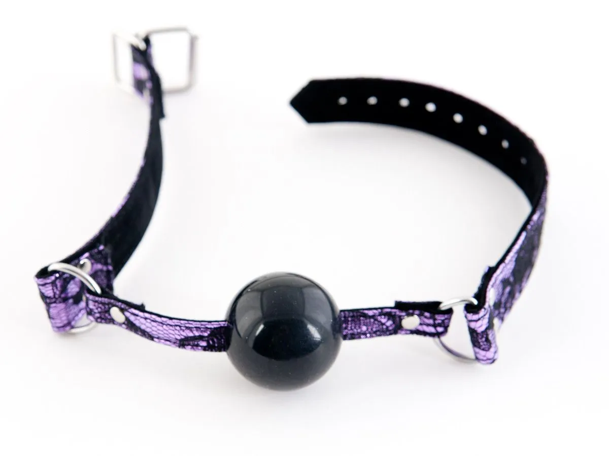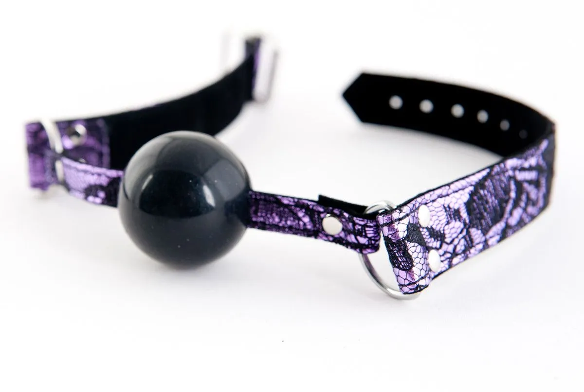 Королевское сочетание пурпура и кружева только для любимой невольницы.  Упругий силиконовый кляп заставит замолчать, но остаться прекрасной одалиской.