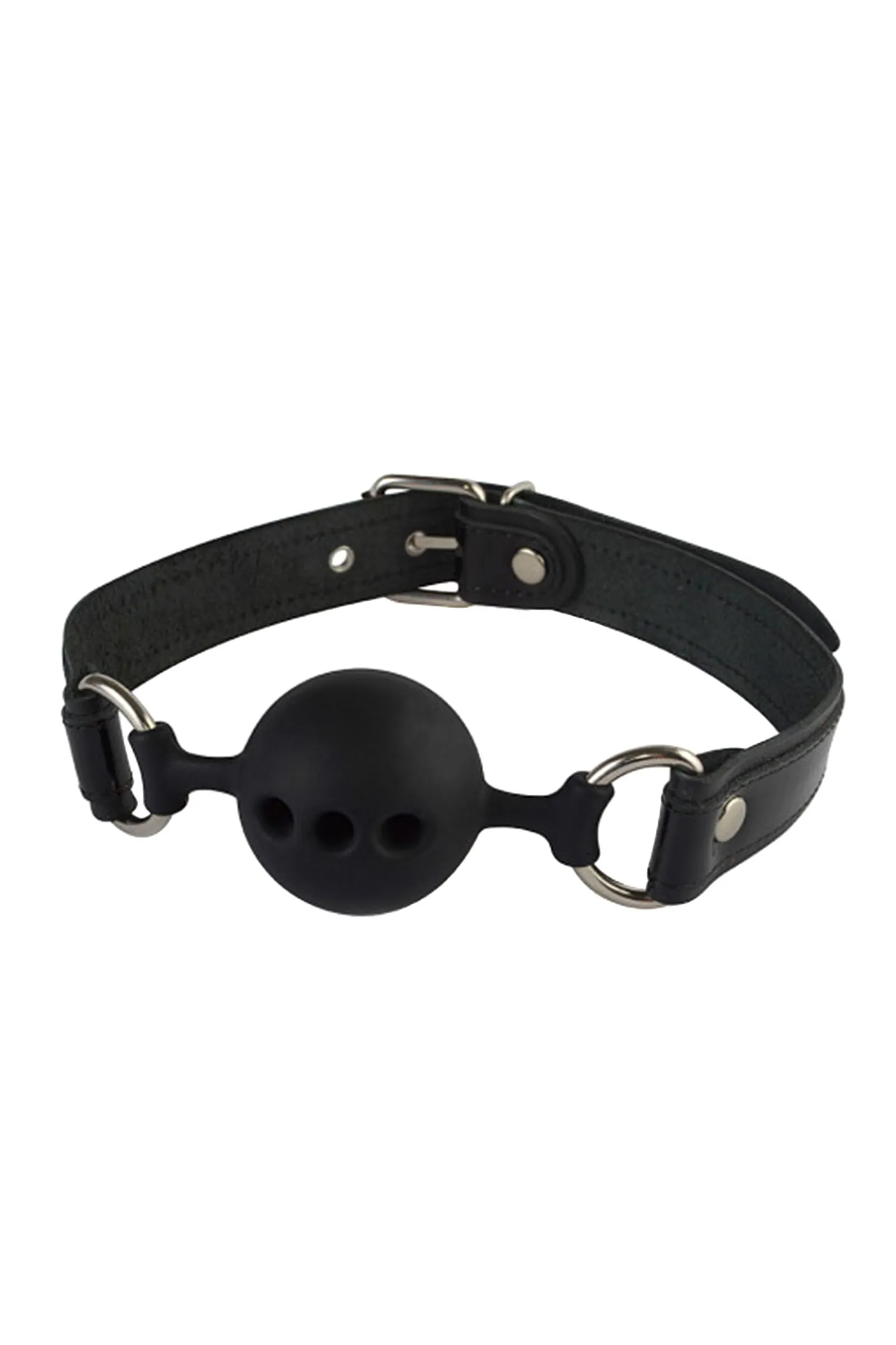 Кляп с оригинальным кожаным ремешком и лаковыми вставками черного цвета. Сам кляп-шар изготовлен из силикона, приятного на ощупь, со специальными отверстиями, пропускающими воздух.
