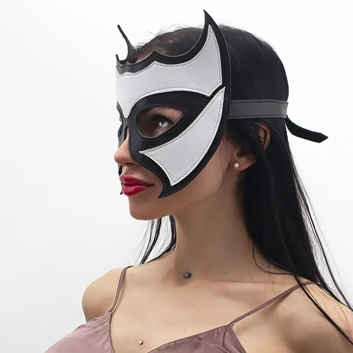 В этой стильной маске великолепно сочетаются белый и черный цвета. Выглядит она очень эффектно благодаря оригинальной форме. Выполнен данный аксессуар из натуральной кожи, это авторская ручная работа. Такая маска-очки отлично дополнит эротический образ в стиле БДСМ. Если Вам близко данное направление, то и этот атрибут для интимных игр Вам понравится.