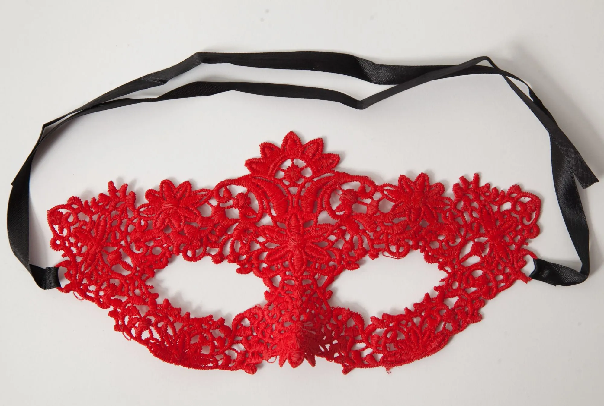 Красная кружевная маска в венецианском стиле с многочисленными узорами. Завязывается на черные атласные ленты. Размеры маски: длина- 24,5 см, ширина - 11 см. Упаковка- картонный конверт.
