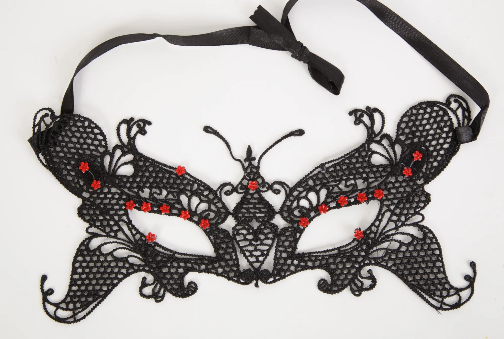 Кружевная маска в венецианском стиле в форме бабочки, украшена красными бусинками. Завязывается на атласные ленты. Размеры маски: длина- 26 см, ширина - 12 см. Упаковка- бумажный пакет.
