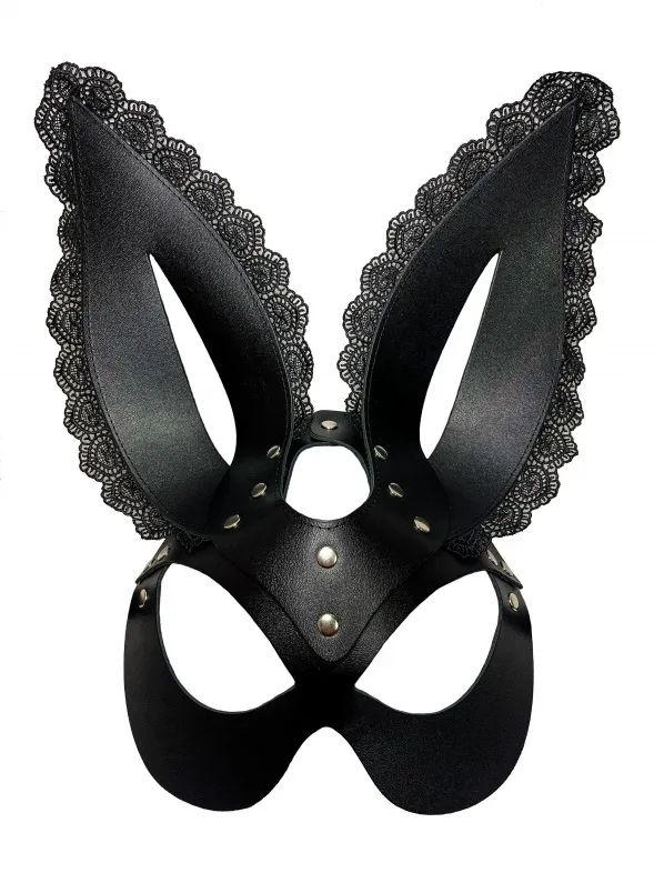 Супер-эффектная и сексуальная маска зайки. Выполнена маска из плотной черной кожи высокого качества, она отлично держит форму. Ушки декорированы красивым чёрным кружевом, что придает образу кокетства.Подойдет к любому типу лица, отлично подчекнув глаза. Ушки длинные, стоячие. Фиксируется маска на металлическую пряжку сзади. Этот аксессуар станет главной фишкой вашего образа, добавит сексуальности и игривого настроения!