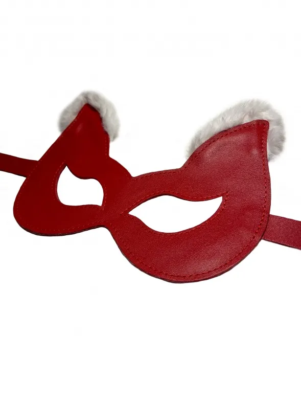 Игривая маска красного цвета, выполненная из натуральной кожи. Ушки маски украшены нежным белым эко-мехом, что придаёт ей яркости. Фиксируется сзади с помощью металлической пряжки, позволяя выбрать комфортный обхват головы. Форма макси эффектно подчеркивает глаза и создаёт необычный образ.