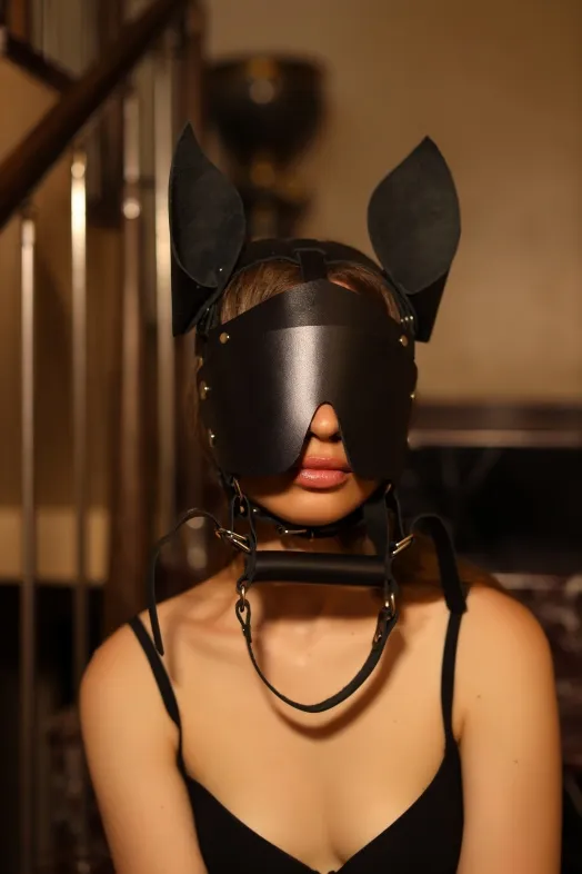 Качественная и многофункциональная маска для любителей пони-плей и пет-плей.  Аксессуар полностью выполнен из натуральной плотной кожи в черном цвете, декорирован качественной металлической фурнитурой. Маска имеет стоячие ушки, в комплекте идет широкая маска на глаза, шоры и кляп-уздечка, все эти элементы съёмные и открывают огромный простор для фантазии во время игры.