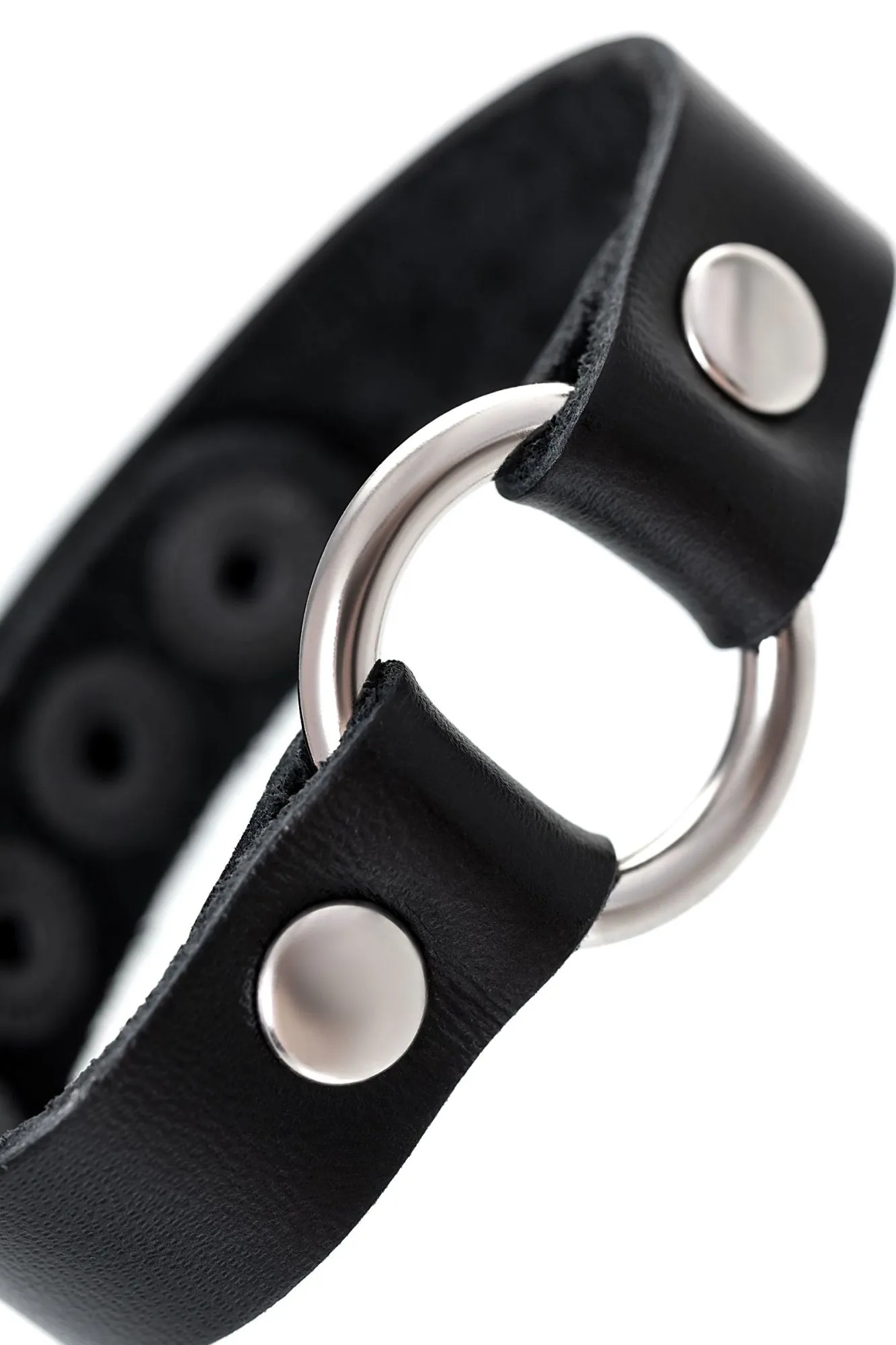 Браслет из натуральной кожи черного цвета украшен металлическим кольцом. Регулируется при помощи кнопок. Длина браслета 21 см, ширина 1,5 см. Металлическое кольцо имеет никелевое покрытие. Масса нетто 10 гр.