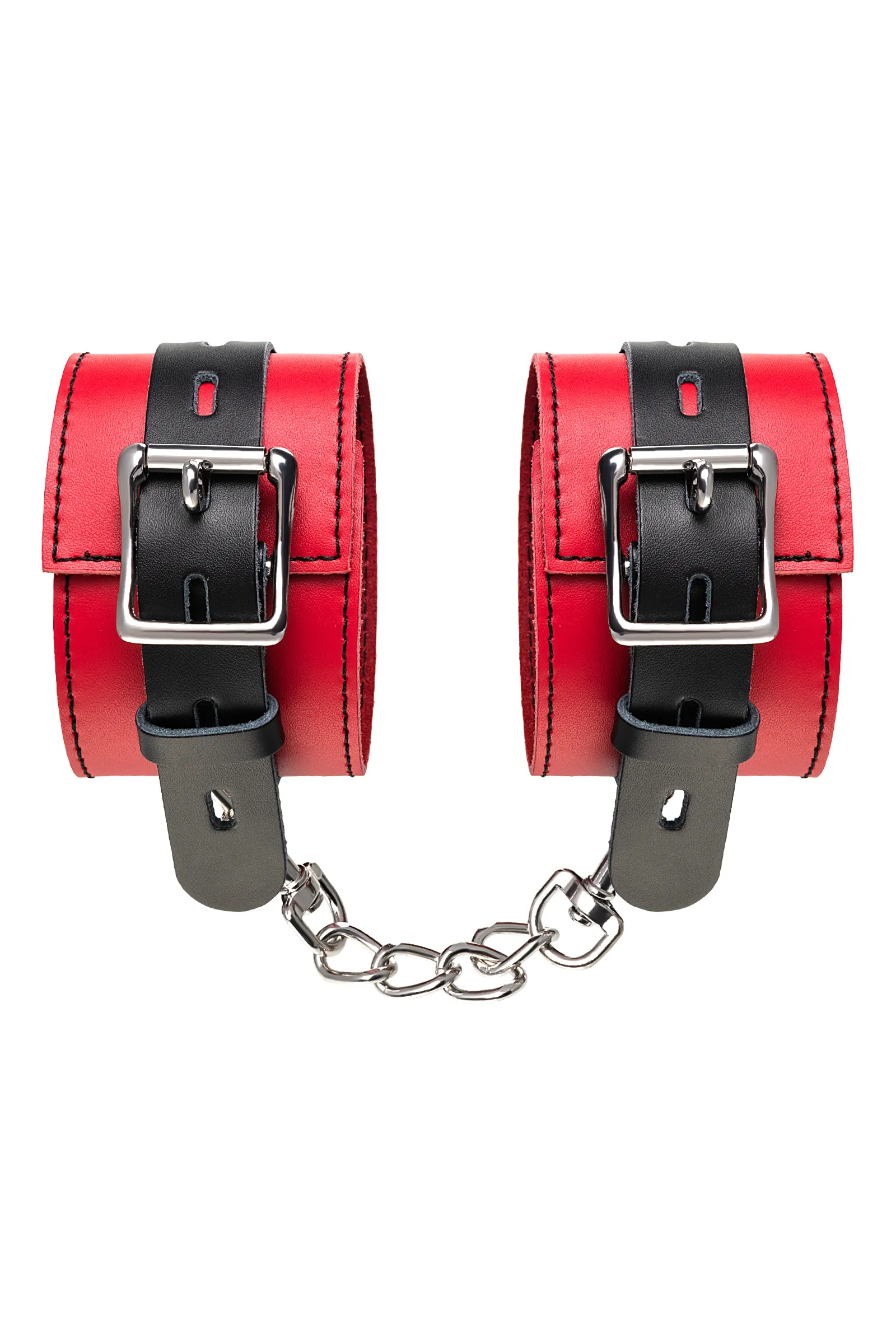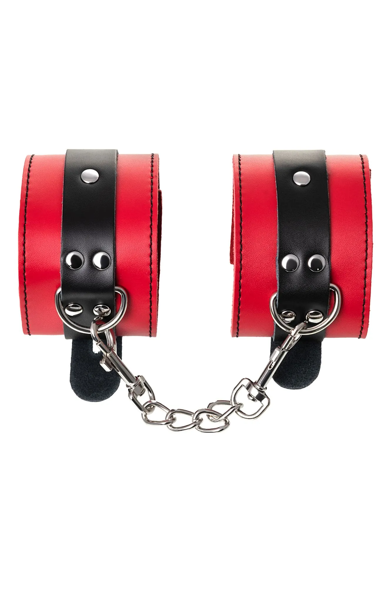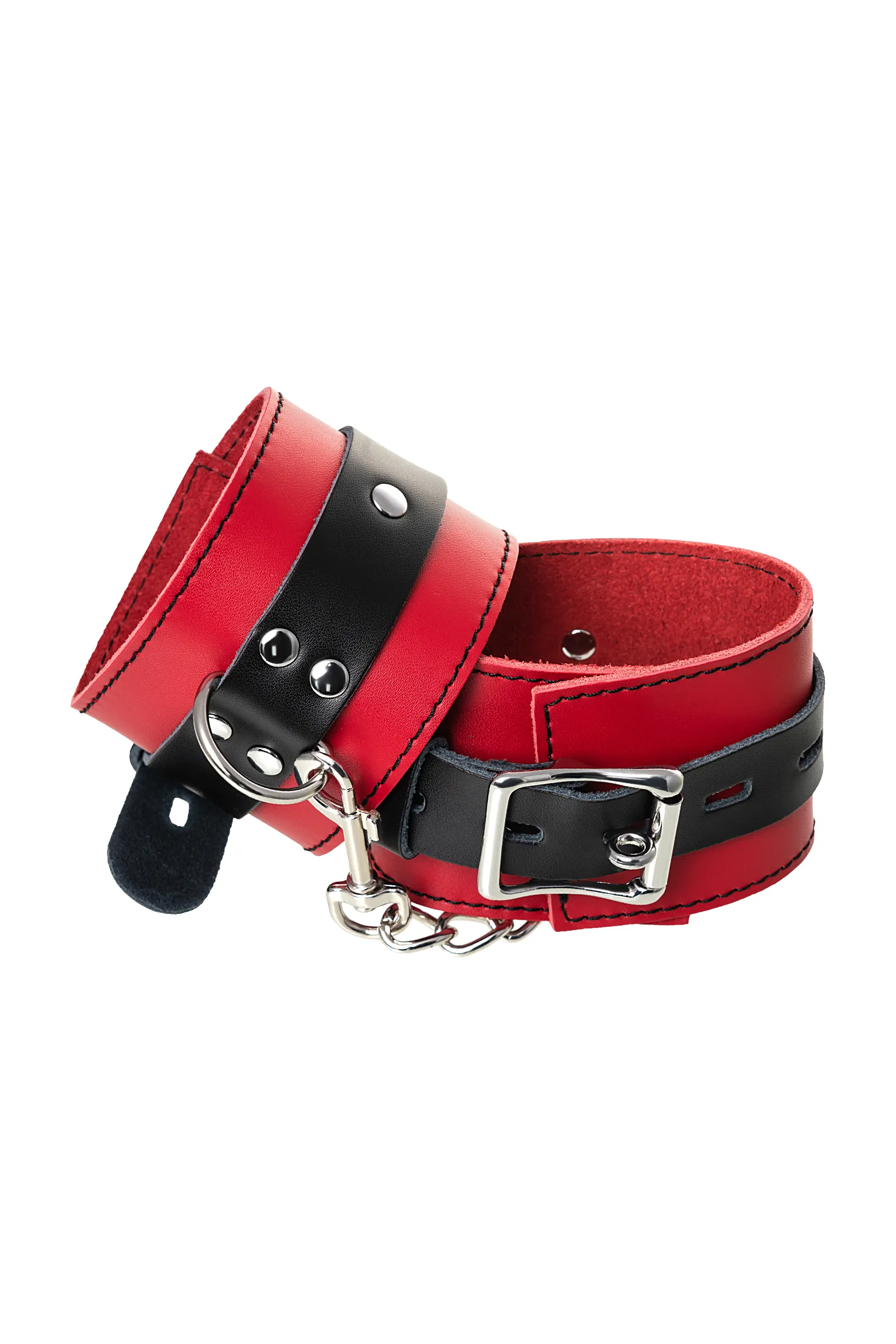 Наручники Наручники - волнующий воображение аксессуар, ведь это способ зафиксировать руки партнера и получить полный доступ к его телу. Но не забудьте про стоп-слово. Наручники из мягкой натуральной кожи сочетают в себе элементы, возбуждающие страсть и фантазию: красный и черный цвета и отделка металлическими элементами. В них будет комфортно подчиняться и ощущать ограничение свободы действий. Не натирают и имеют надежную степень фиксации. Размер легко регулируется металлической пряжкой. Эта пара - отличный вариант для начинающих в БДСМ-играх. Так почему бы не открыть для себя что-то новое? Длина наручников 23 см Ширина наручников 6 см Длина сцепки 15,5 см Материал: кожа, металл В фотосессии на модели использованы пэстис Theatre 705006