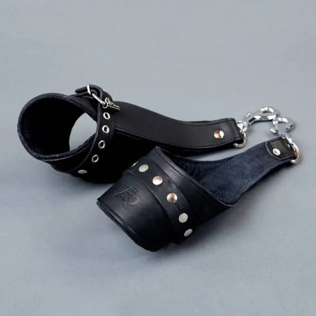 Наручи для подвешивания от фирмы "Подиум" помогут Вам обездвижить партнера и насладиться его беспомощностью перед Вами. Наручники выполнены из натуральной кожи и украшены металлическими заклепками. У них есть мягкая подкладка из синтетической пены, так что они не нарушат кровообращение и не повредят кожу. Анатомическая конструкция при правильном использовании исключает вероятность получения травмы. Наручники регулируются по размеру, фиксируются удобным ремешком.
