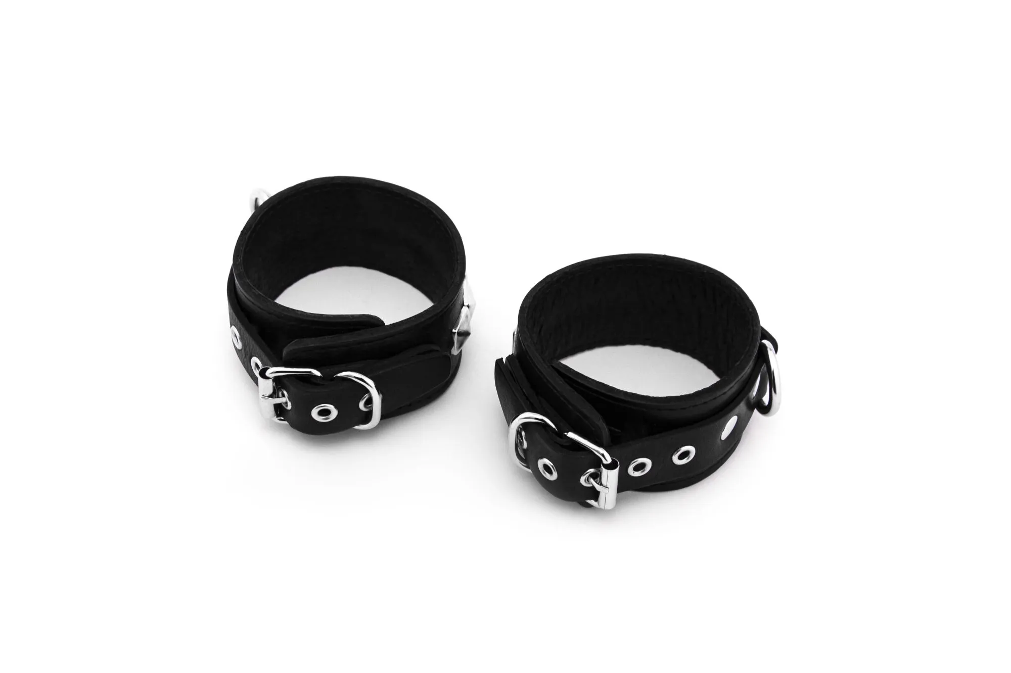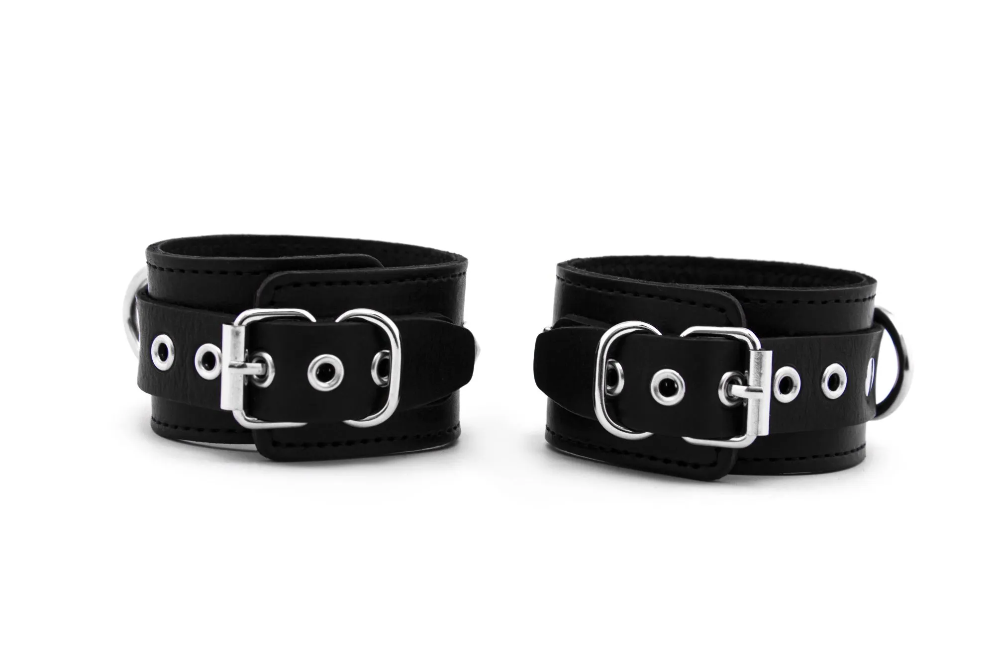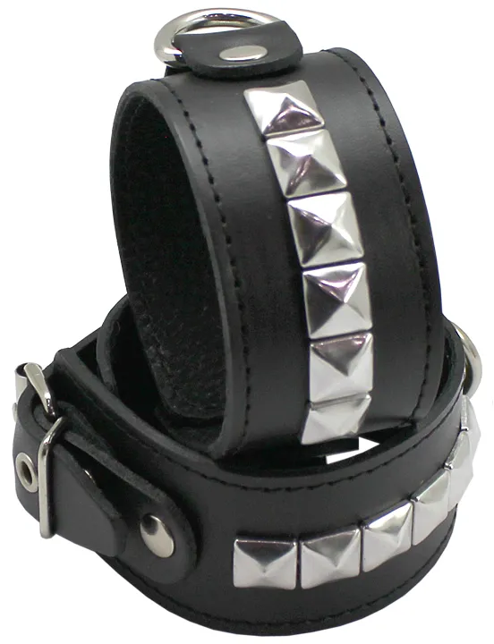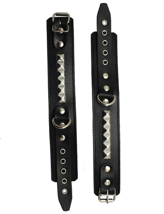 Узкие наручники выполнены из натуральной кожи черного цвета. Данная модель украшена 5 квадропуклями и оснащена кольцом, которое позволяет использовать различные бондажные системы такие как карабины, веревки и т.д. Размер наручников регулируется при помощи застежки - пряжки. Мягкая подкладка обеспечивает комфорт и удобство использования.