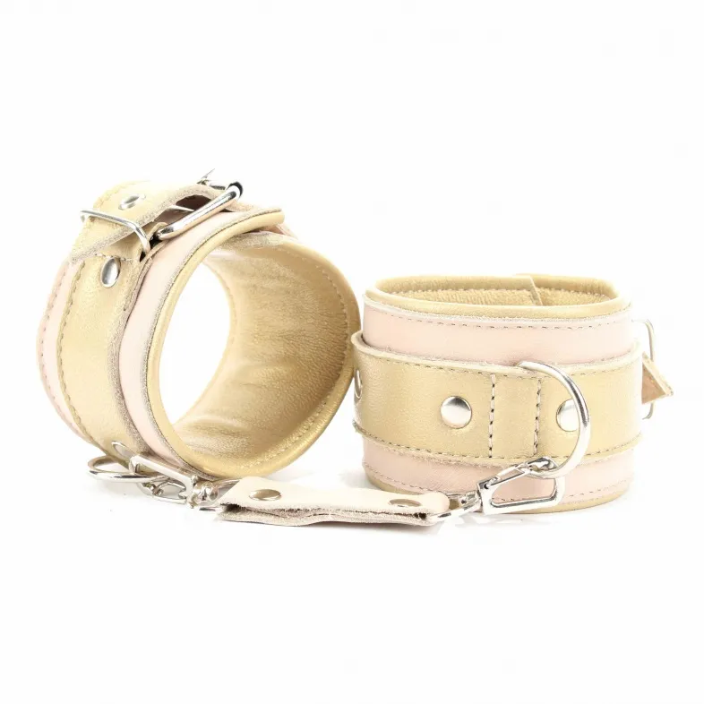 Наручники из натуральной кожи бежевого цвета с золотистойй отделкой из нежной перчаточной кожи. Сварная металлическая фурнитура и цельный хлястик для надежной фиксации. Ширина - 6 см.,Не нарушают кровообращение, надёжно фиксируются на запястьях с помощью ремешков. Размер универсальный, регулируемый.