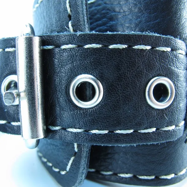 Оживить эротические игры Вам помогут наручники. Этот интимный аксессуар пользуется успехом у мужчин. Выполненные в черном цвете с белой отстрочкой и украшены прочными ремешками. Модный интимный аксессуар не сдавливает и не нарушает кровообращение, так как изготовлен из мягкой кожи. Чтобы любимая никуда не убежала, наручники соединены короткой перемычкой. Ширина оков - 6 см, длина оков- 26,5 см, длина перемычки – 6 см, производитель – BDSM Арсенал (Россия).
