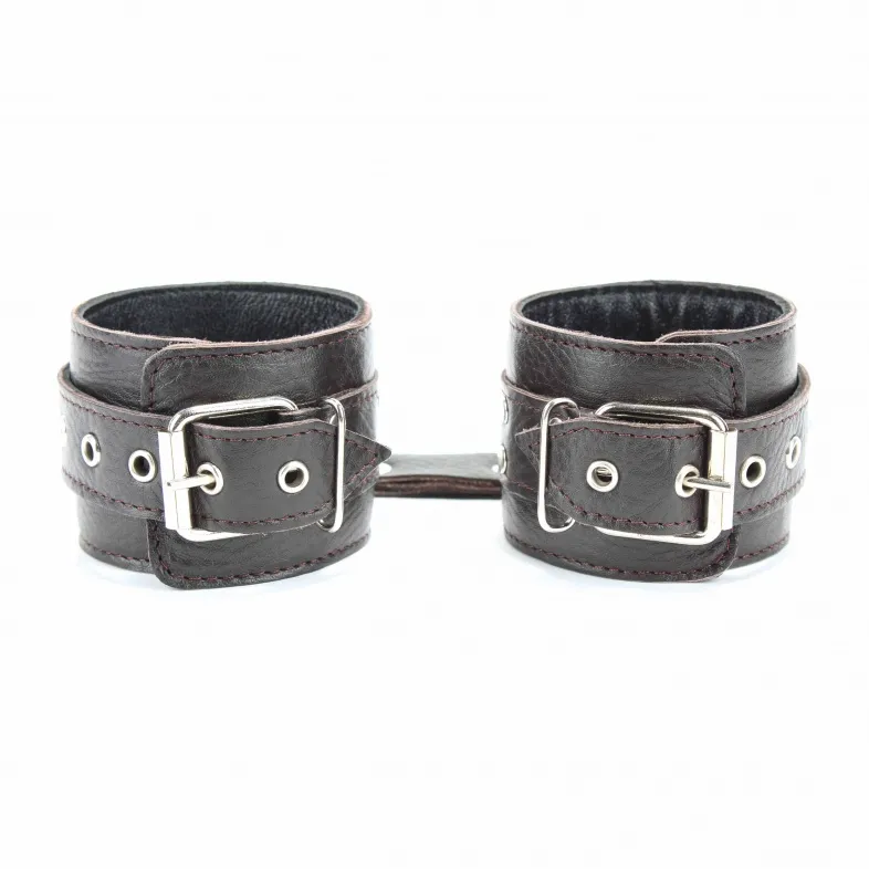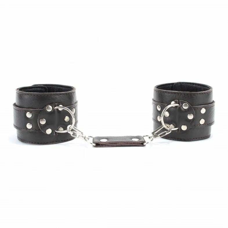 Кожаные наручники потрясающего коричневого цвета.Ширина - 6 см. Украшены заклепками и соединяются между собой цепью с карабинами (длина цепочки - 13 см) Размер наручников регулируется при помощи застежки.