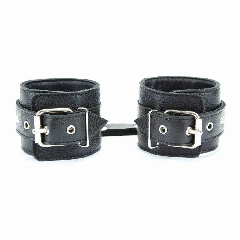 Кожаные наручники черного цвета.Ширина - 6 см. Украшены заклепками и соединяются между собой цепью с карабинами (длина цепочки - 15,5 см) Размер наручников регулируется при помощи застежки