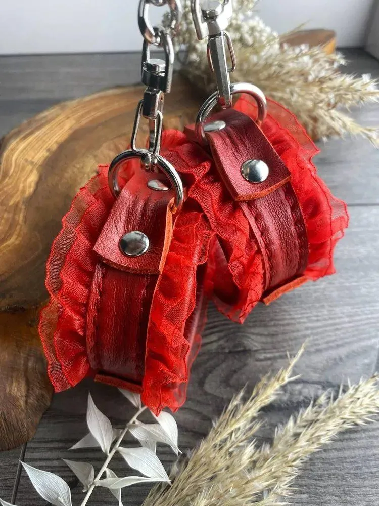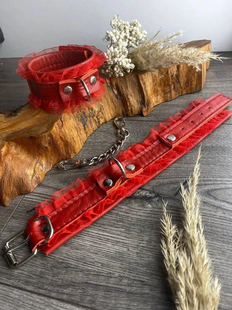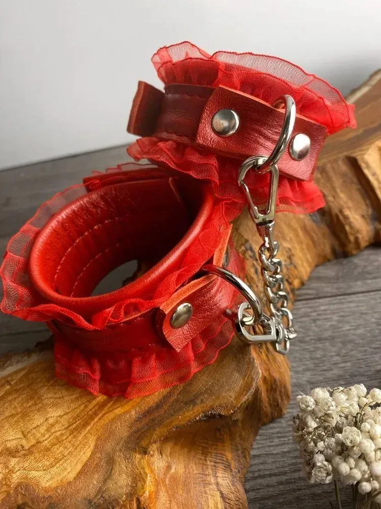Теперь Вы можете быть уверены, что Ваш пленник не сбежит от Вас, если Вы обездвижите его с помощью этого БДСМ-аксессуара. Красные наручники декорированы металлическими клепками и соединены между собой при помощи цепочки. Ремешки с пряжками позволяют отрегулировать диаметр оков. Привнесите в Ваши интимные отношения немного разнообразия с помощью этого приспособления для сексуальных утех.
