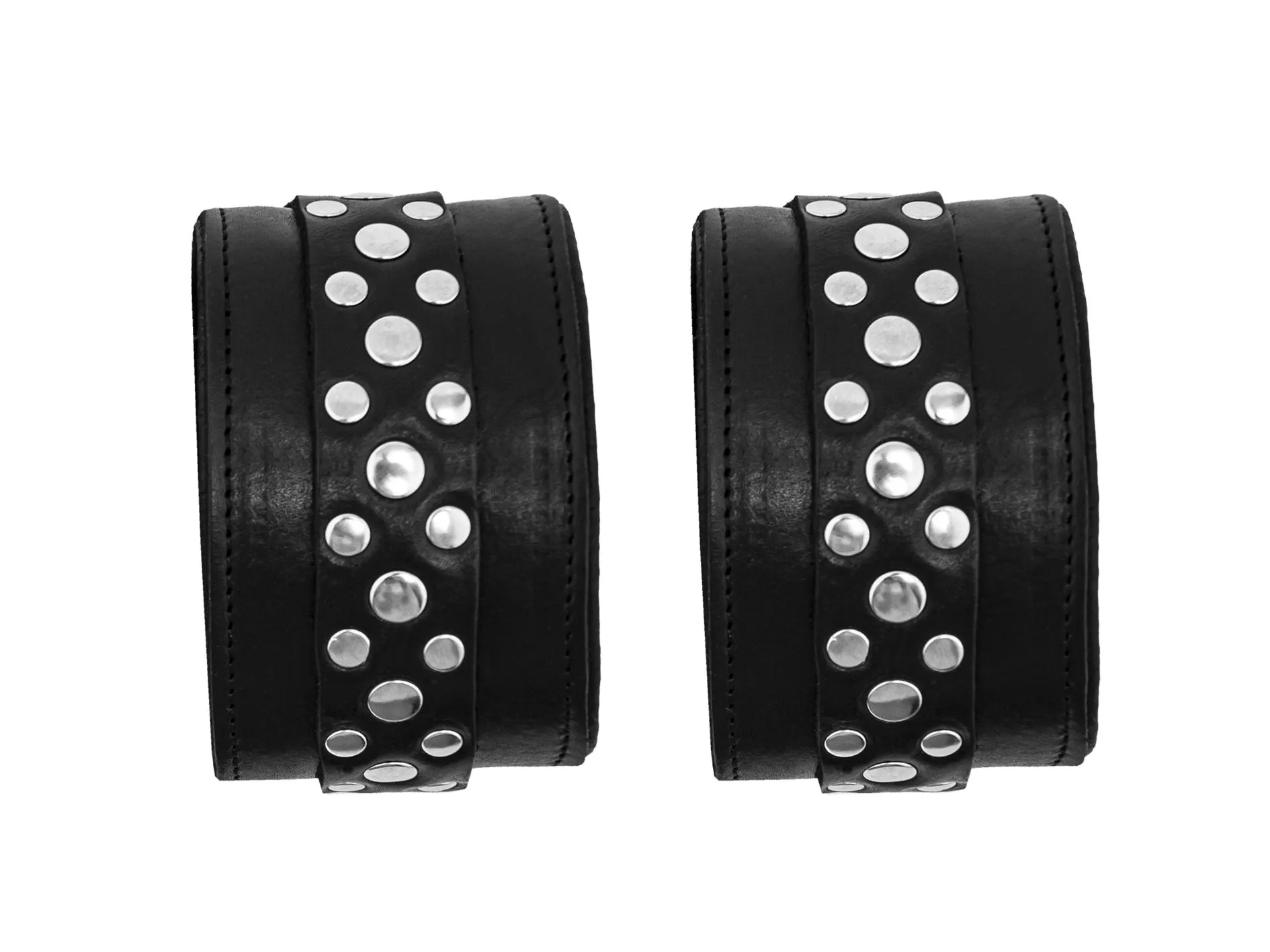 Они не нарушают кровообращение, просты в применении и обеспечивают надежную фиксацию. Данная модель изготовлена из натуральной кожи черного цвета с геометрическим рисунком из двух видов заклепок. Наручники оснащены удобным фиксирующим ремешком, позволяющим регулировать размер наручника. Мягкая подкладка (пена) обеспечит комфорт и безопасность.