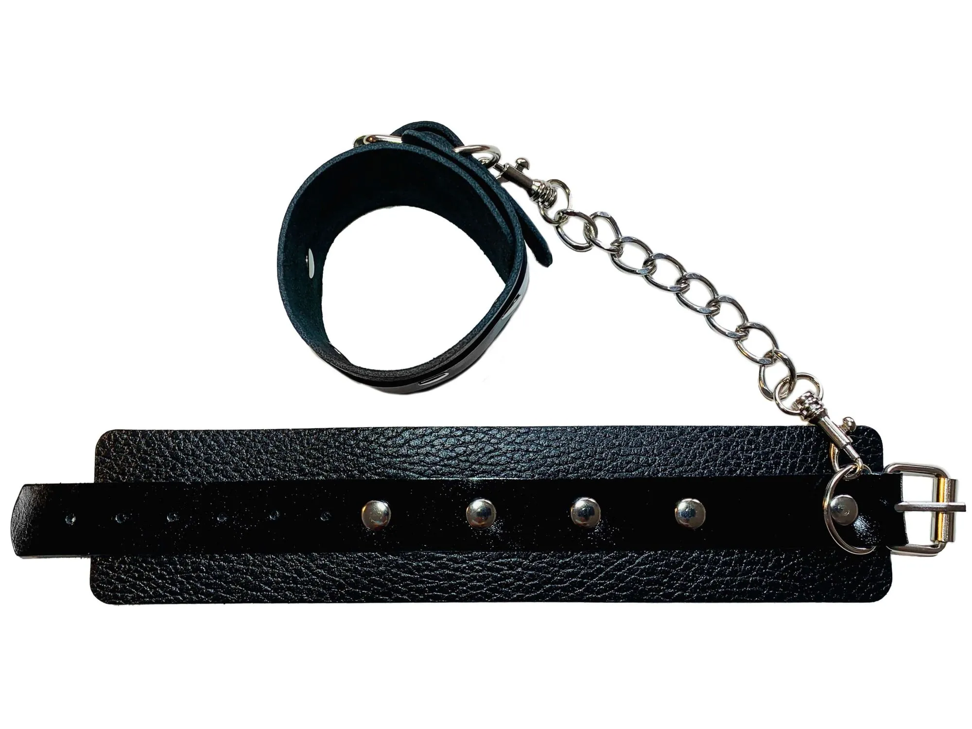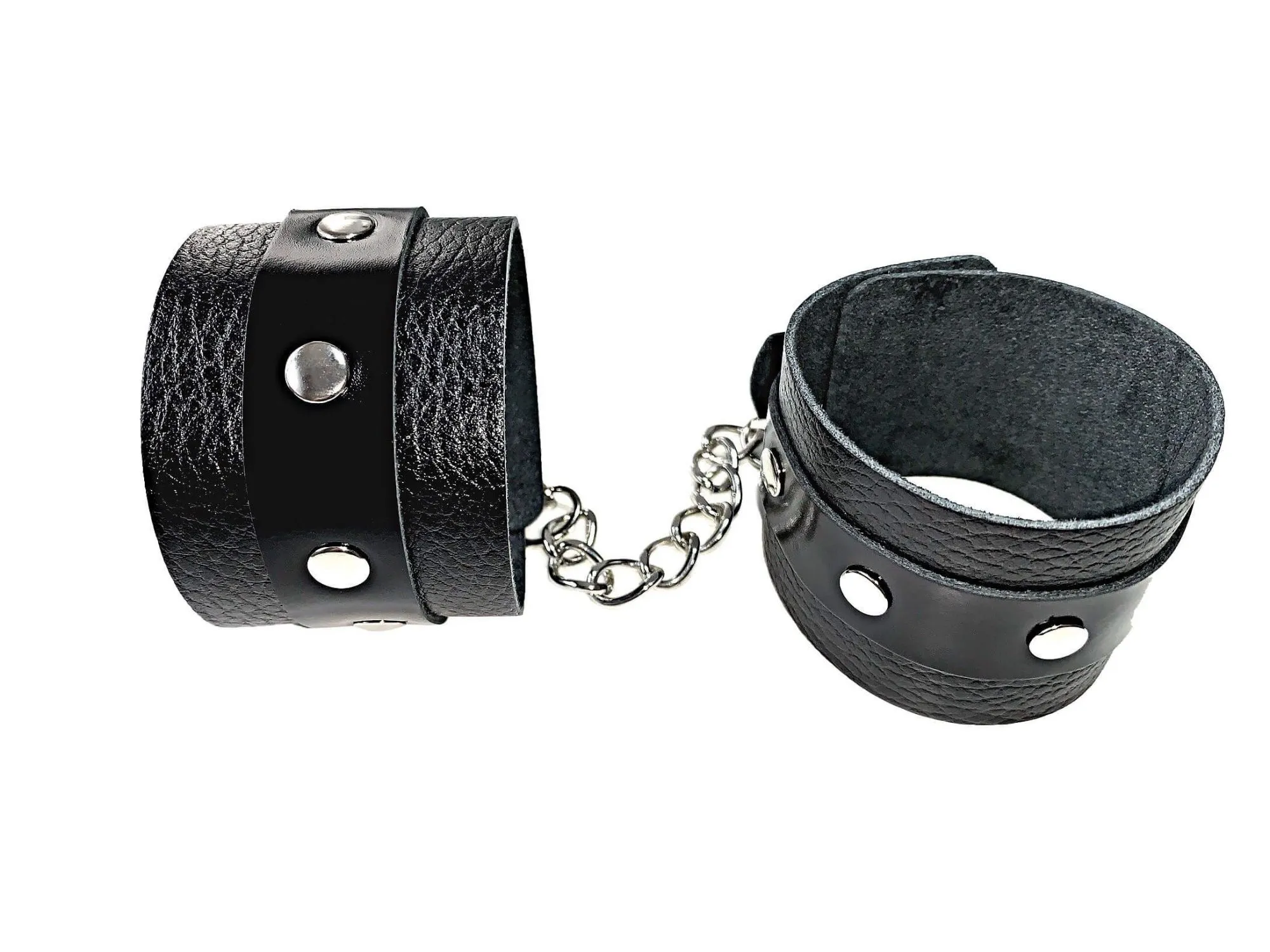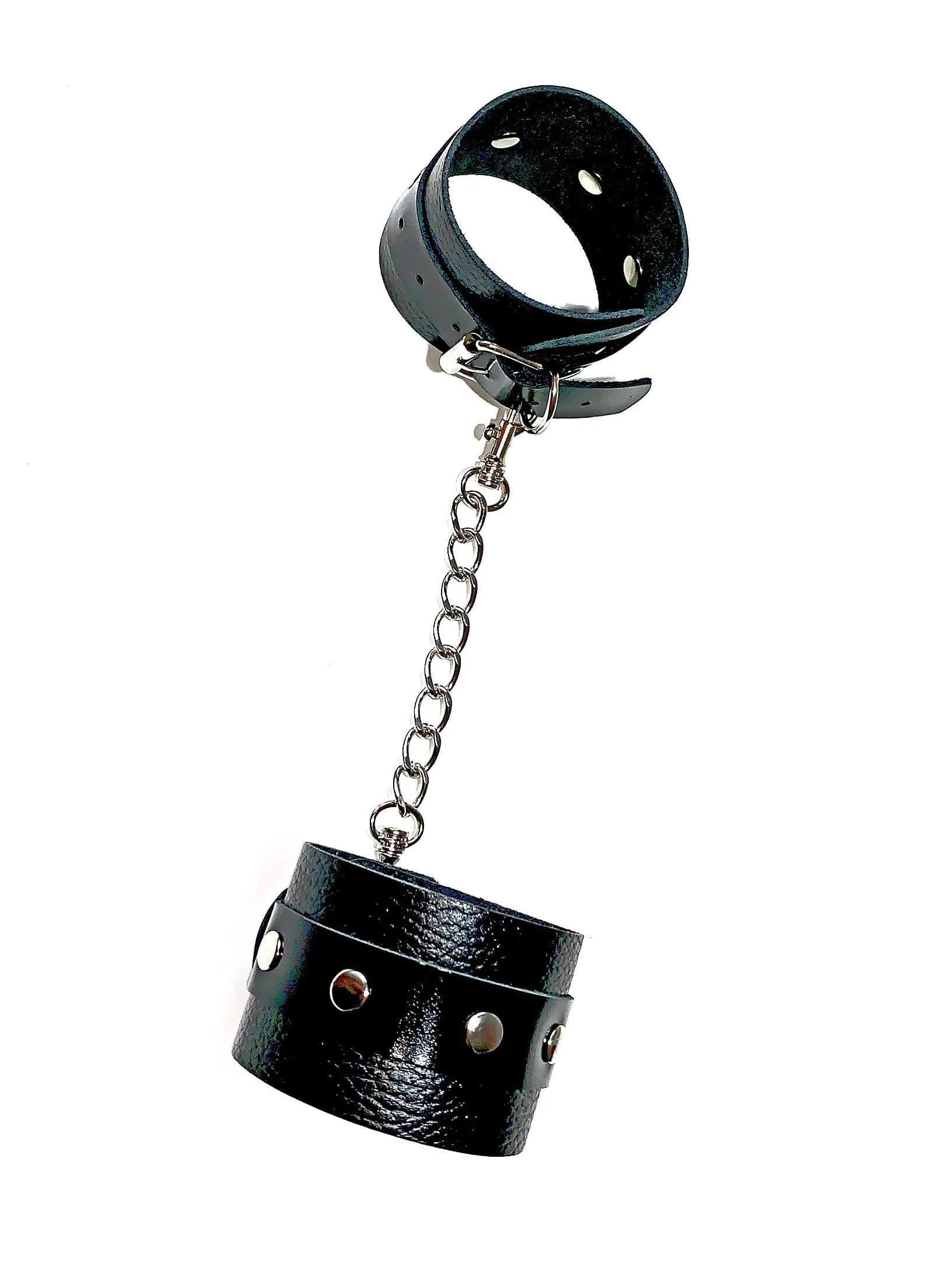 Наручники соединены между собой прочными карабинами с металлической цепью длиной 12 см. Размер наручников регулируется благодаря кожаным ремешкам.