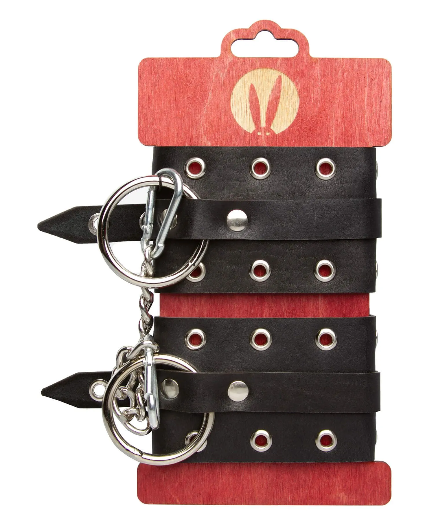 Однослойные оковы от бренда Pink Rabbit выполнены из натуральной кожи черного цвета и декорированы люверсами. К широким металлическим кольцам на оковах можно присоединить и другие аксессуары при помощи карабинов. Оковы регулируются по размеру при помощи ремешка с пряжкой.