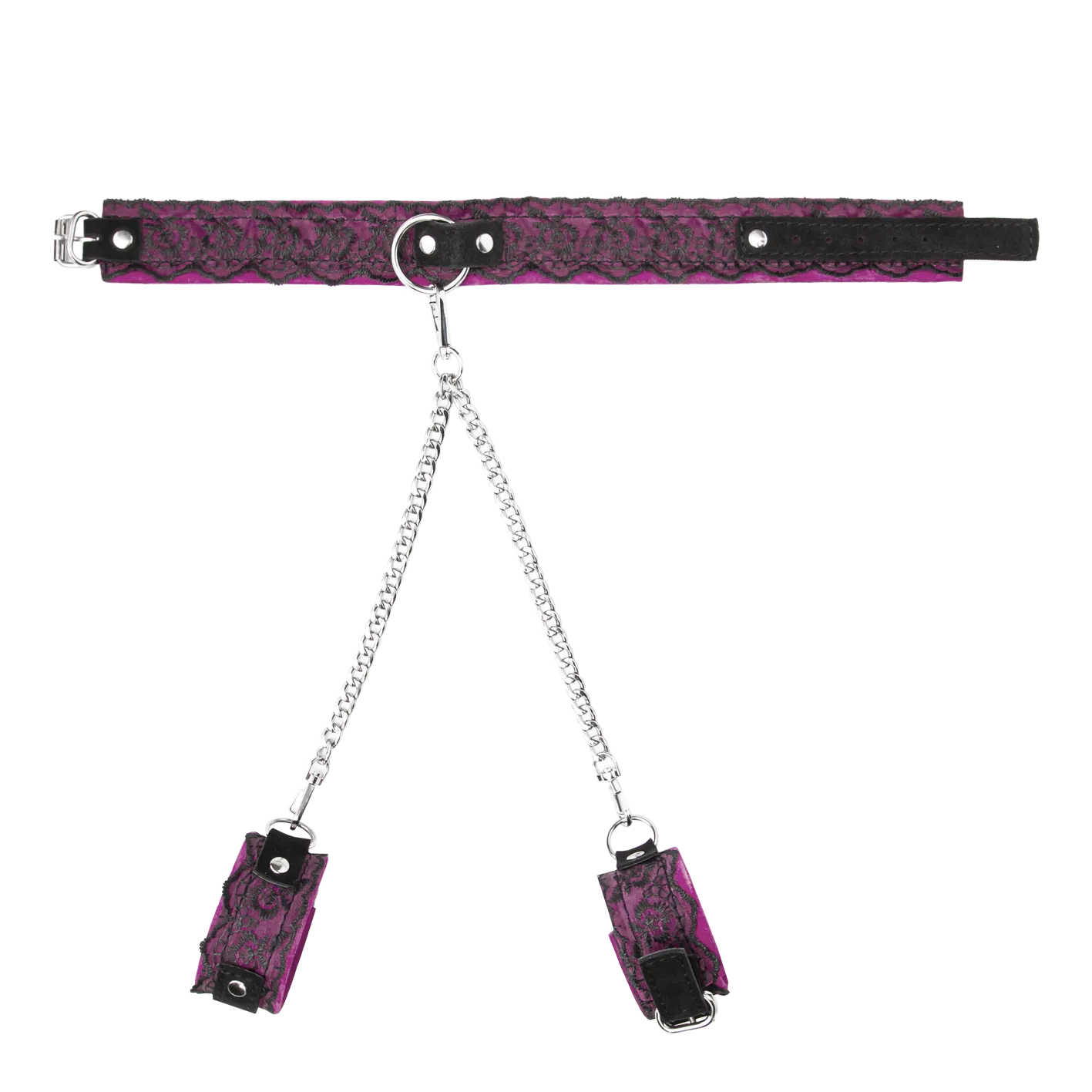 Между собой наручники и ошейник соединяются стяжкой с двумя цепочками. Размер регулируется при помощи ремешков с пряжками.