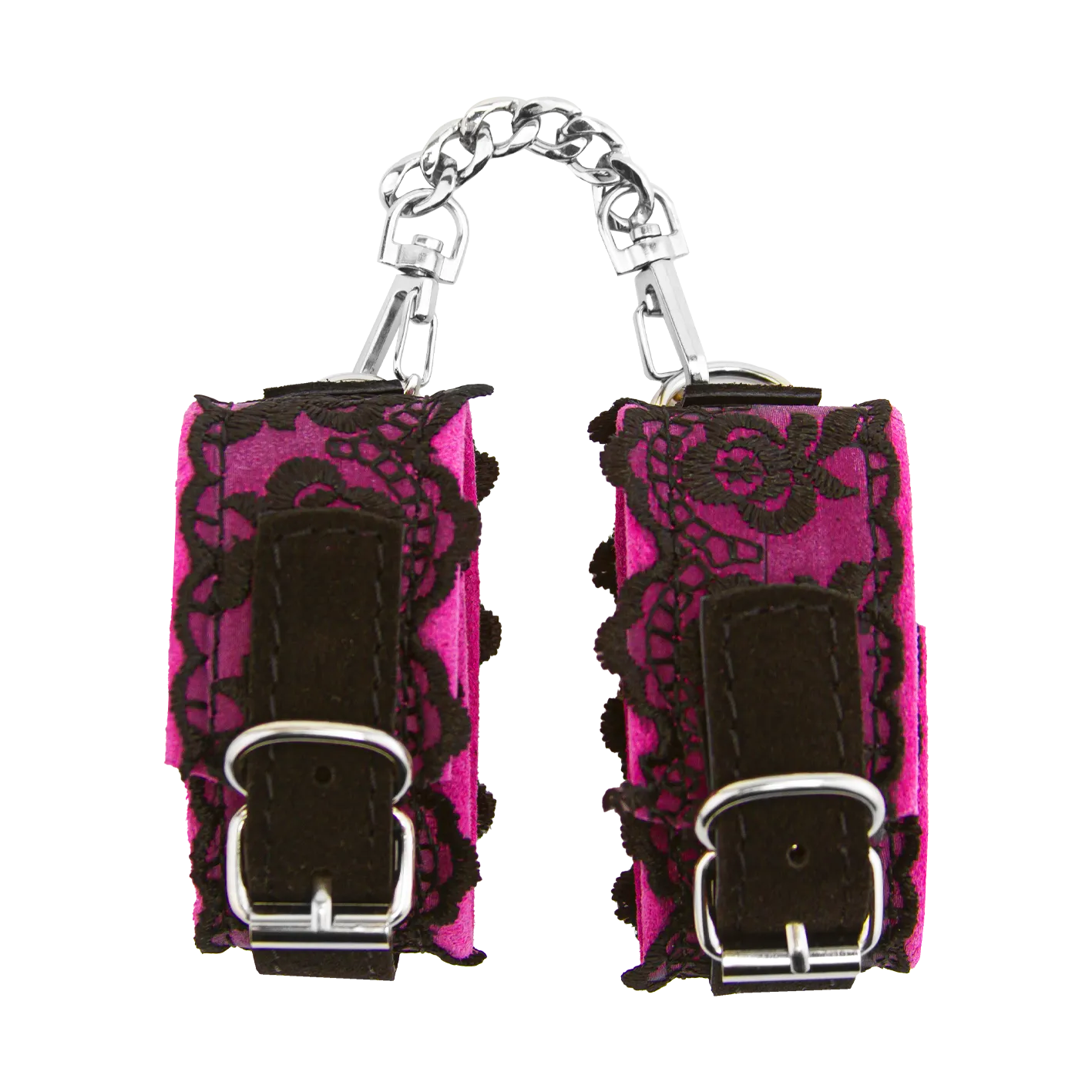 Наручники сделаны из замши и декорированы тонким кружевом. Они соединены между собой металлической цепочкой на карабинах. Наручники регулируются по размеру ремешками с пряжками.