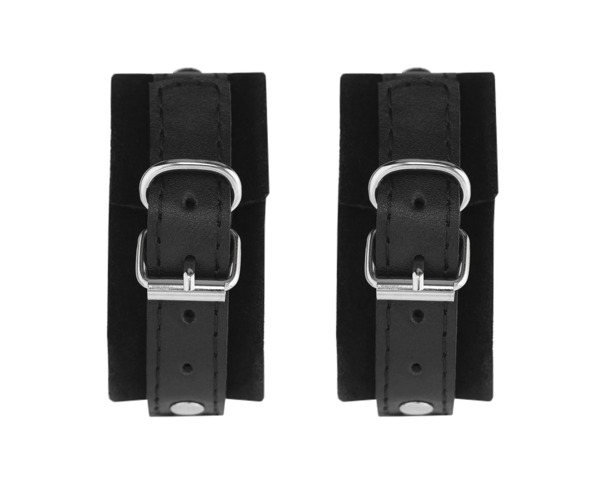 Наручники сделаны из натуральной кожи черного цвета и соединены между собой карабином. Они регулируются по размеру при помощи ремешков с пряжками.