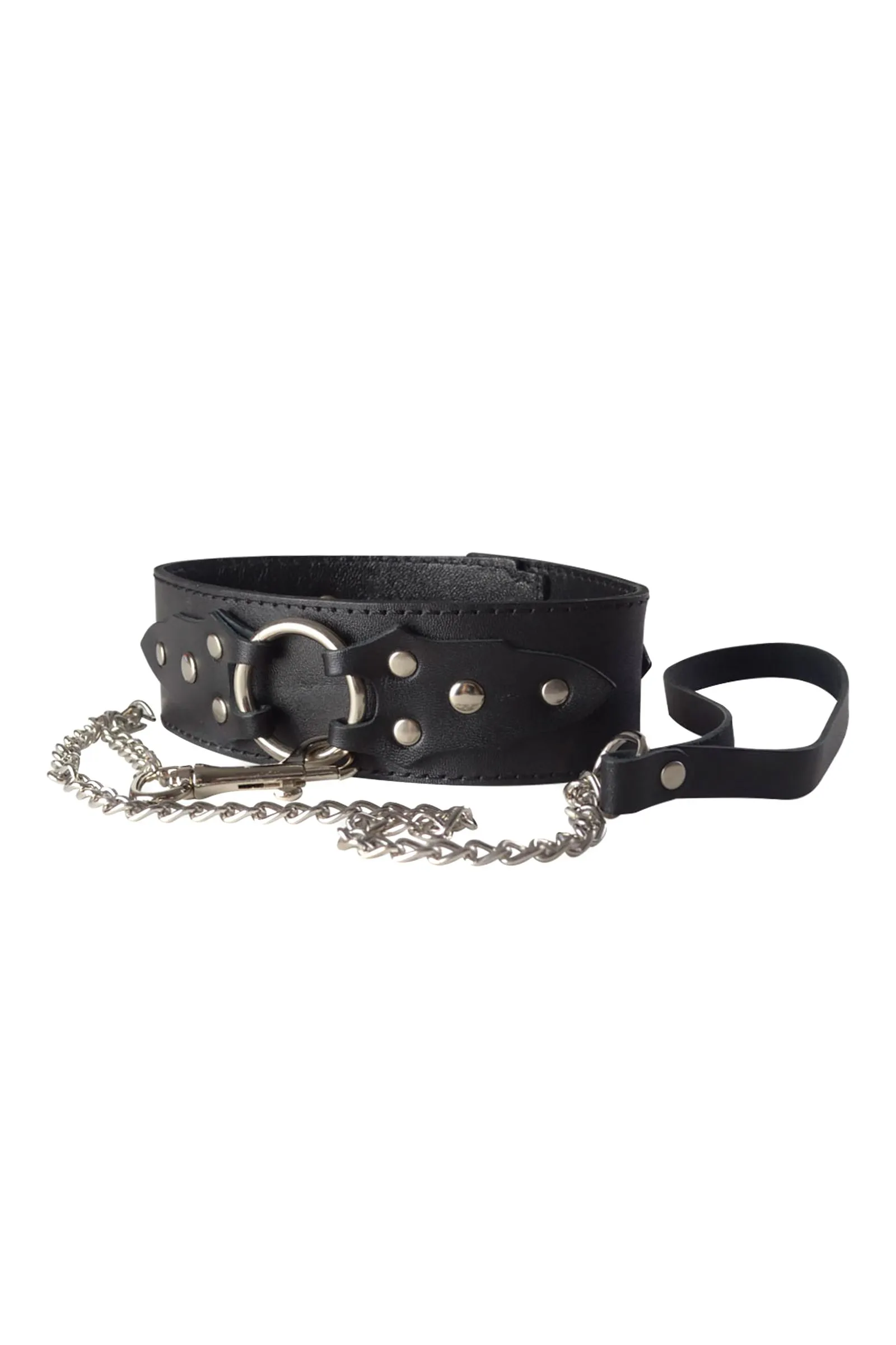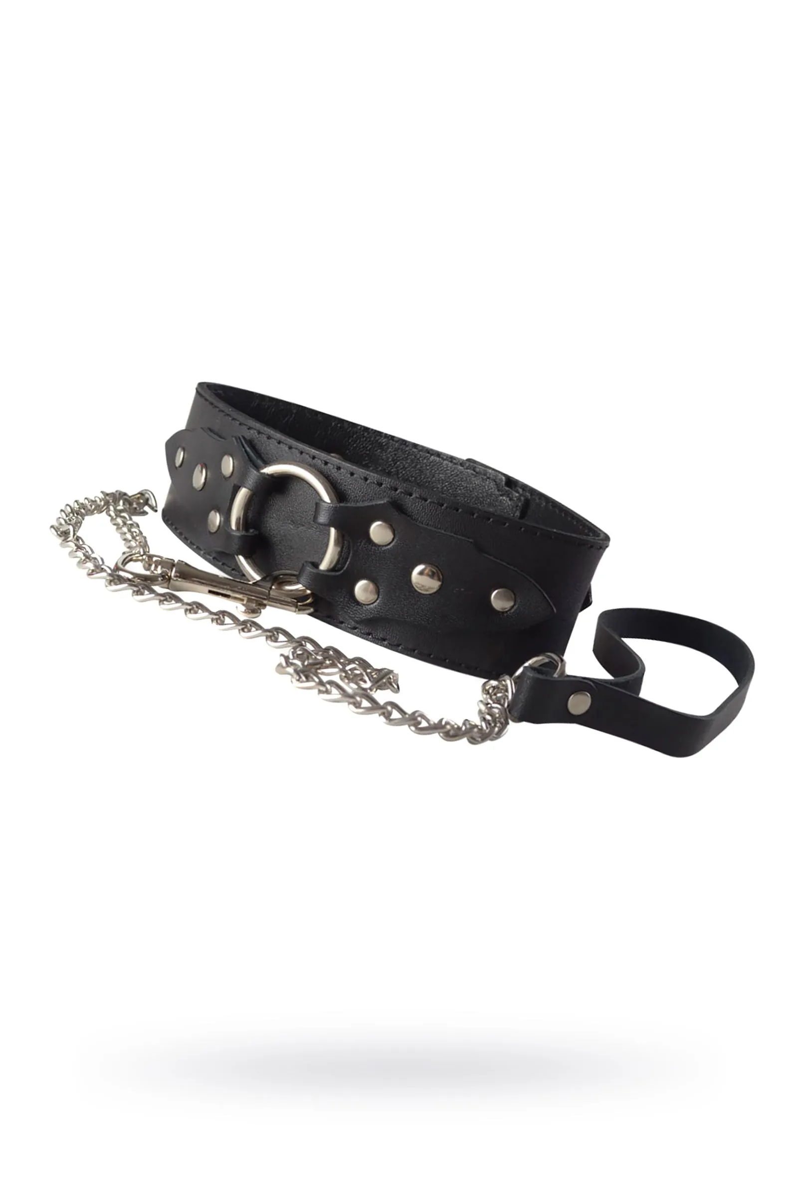 Ошейник средней ширины, украшенный декоративной цепочкой. Изготовлен из натуральной кожи и никелированной фурнитуры. Размер универсальный.