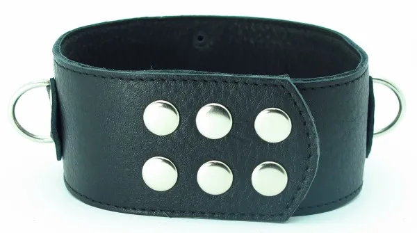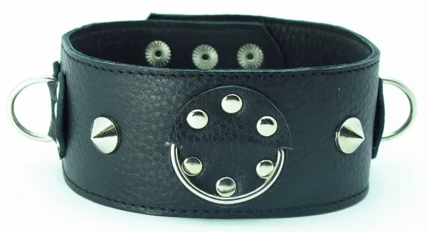 Черный кожаный ошейник с короткими шипами. Имеет три кольца для карабинов, два ряда заклепок-застежек. Ширина ошейника - 5см. Размер регулируется.
